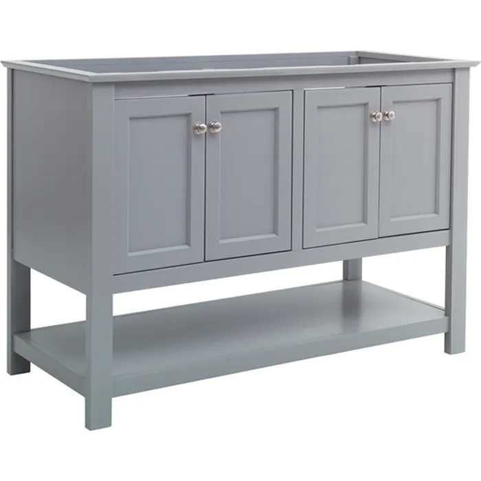 Add instant style and classic charm to your bathroom with the clean, timeless design of our Fresca Manchester 48” Traditional Double Sink Bathroom Cabinet. This beautifully constructed cabinet features solid wood doors that open to reveal two roomy compartments for organizing products of varying sizes and keeping all of your bathroom essentials within reach. Soft close hinges ensure the doors close silently and effortlessly every time. Open bottom shelves are ideal for storing towels and additional bath supplies. This traditional cabinet has an elegant, painted Gray finish and brushed nickel handles. It includes installation hardware and is available in several sizes and finishes to meet your decorating needs.