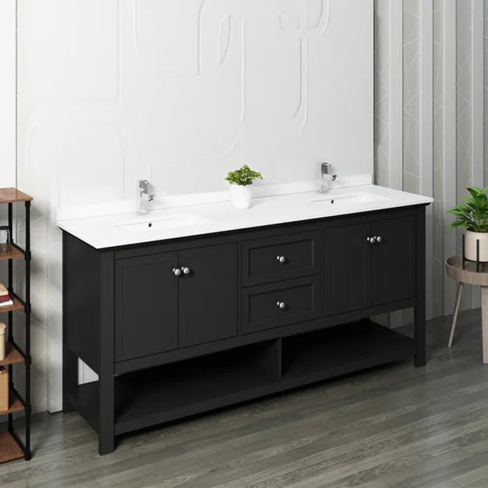 Add instant style and classic charm to your bathroom with the clean, timeless design of our Fresca Manchester 72” Traditional Double Sink Bathroom Cabinet with Top & Sinks. This beautifully constructed cabinet features solid wood doors that open to reveal two roomy compartments for organizing products of varying sizes and two soft closing drawers for additional out-of-sight storage. Soft close hinges ensure the doors close silently and effortlessly every time. Open bottom shelves are ideal for storing towels and additional bath supplies. This traditional cabinet has an elegant, painted Black finish and brushed nickel handles. Gracing the top of the cabinet is a lovely integrated white ceramic double sink and countertop which adds to its clean aesthetic. Designed for durability and style, each sink has a rounded basin with an integrated overflow and single hole faucet mount. This stylish cabinet with top and sinks is offered in a choice of finishes and is available in several sizes. It includes installation hardware. The matching Fresca Manchester Black Traditional Bathroom Mirror (sold separately) completes the look.