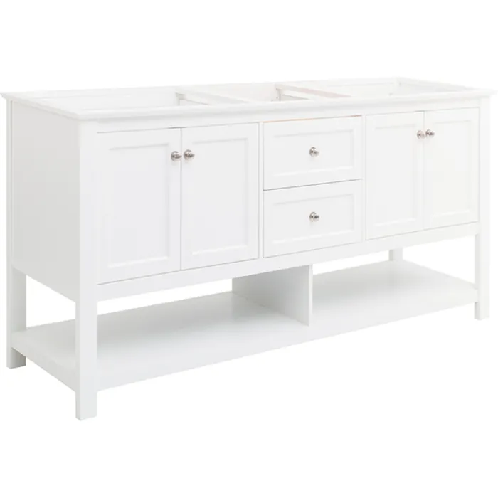 Brighten your bathroom with the clean, timeless design of our Fresca Manchester 72” Traditional Double Sink Bathroom Cabinet. This beautifully constructed cabinet features solid wood doors that open to reveal two roomy compartments for organizing products of varying sizes and two soft closing drawers for additional out-of-sight storage. Soft close hinges ensure the doors close silently and effortlessly every time. Open bottom shelves are ideal for storing towels and additional bath supplies. Designed to complement any décor scheme, this traditional cabinet has an elegant, painted White finish and brushed nickel handles. It includes installation hardware and is available in several sizes and finishes to meet your decorating needs.