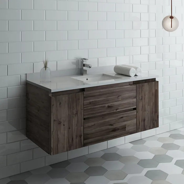 The Fresca Formosa 48" Wall Hung Modern Bathroom Cabinet with Top & Sink is superbly crafted of solid Acacia wood, known for its magnificent beauty and durability. It has a warm grey finish with a hint of brown throughout, and a natural grain that will inject luxurious warmth into any space. A masterpiece of elegance and style, this wall-mounted cabinet measures 48” in width. With solid wood, soft-closing dovetail drawers and two roomy cabinets, this bathroom cabinet features tons of storage, ideal for keeping a family organized. The solid pine drawers are clear coated and feature a mitered, wrap-around design that adds to the superior detailing. Cove routed pulls are carved directly into the drawers and cabinet doors, keeping the design sharp and sophisticated. Gracing the top of the cabinet is a stunning quartz stone countertop and ceramic undermount basin. The white ceramic basin is equipped with an overflow and the countertop has been pre-drilled to accommodate a single hole faucet (sold separately). The Fresca Formosa Wall Hung Modern Bathroom Cabinet with Top & Sink is available in multiple sizes and styles. It includes installation hardware.