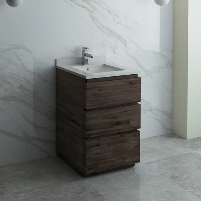 The Fresca Formosa 24" Floor Standing Modern Bathroom Cabinet with Top & Sink is superbly crafted of solid Acacia wood, known for its magnificent beauty and durability. It has a warm grey finish with a hint of brown throughout, and a natural grain that will inject luxurious warmth into any space. A masterpiece of elegance and style, this free-standing cabinet measures 24” in width. Three solid wood, soft-closing dovetail drawers are perfect for organizing all of your daily essentials. While the first two drawers provide plenty of space, the third drawer is deeper with full storage capacity. The solid pine drawers are clear coated and feature a mitered, wrap-around design that adds to the superior detailing. Cove routed pulls are carved directly into the drawers keeping the design sharp and sophisticated. Gracing the top of the cabinet is a stunning quartz stone countertop and ceramic undermount basin. The white ceramic basin has a smooth, contoured design, while the gorgeous quartz stone countertop has clean, square edges. The basin is equipped with an overflow and the countertop has been pre-drilled to accommodate a single hole faucet (sold separately). The Fresca Formosa Floor Standing Modern Bathroom Cabinet with Top & Sink is available in multiple sizes and styles. It includes installation hardware.