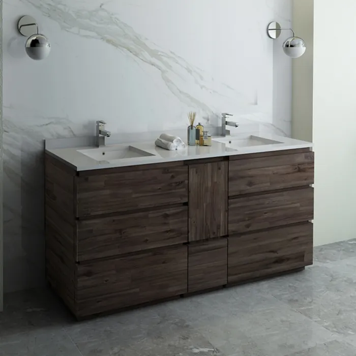 The Fresca Formosa 72” Floor Standing Double Sink Modern Bathroom Cabinet with Top & Sinks is superbly crafted of solid Acacia wood, known for its magnificent beauty and durability. It has a warm grey finish with a hint of brown throughout, and a natural grain that will inject luxurious warmth into any space. A masterpiece of elegance and style, this free standing cabinet measures 72” in width. With large solid wood, soft-closing dovetail drawers beneath each sink, and a roomy cabinet and drawer at the center of the design, this bathroom cabinet features tons of storage, ideal for keeping a family organized. While all drawers provide plenty of space, the bottom drawers are deeper with full storage capacity. The solid pine drawers are clear coated and feature a mitered, wrap-around design that adds to the superior detailing. Cove routed pulls are carved directly into the drawers and cabinet door, keeping the design sharp and sophisticated. Gracing the top of the cabinet is a stunning quartz stone countertop and two ceramic undermount basins. Each white ceramic basin is equipped with an overflow and the countertop has been pre-drilled to accommodate single hole faucets (sold separately). The Fresca Formosa Floor Standing Double Sink Modern Bathroom Cabinet with Top & Sinks is available in multiple sizes and styles. It comes with installation hardware.