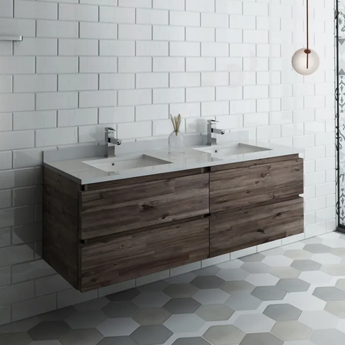 The Fresca Formosa Wall Hung Double Sink Modern Bathroom Cabinet is superbly crafted of solid Acacia wood, known for its magnificent beauty and durability. It has a warm grey finish with a hint of brown throughout, and a natural grain that will inject luxurious warmth into any space. A masterpiece of elegance and style, this wall-mounted cabinet measures 60” in width. With four solid wood, soft-closing dovetail drawers, this bathroom cabinet features tons of storage, ideal for keeping a family organized. The solid pine drawers are clear coated and feature a mitered, wrap-around design that adds to the superior detailing. Cove routed pulls are carved directly into the drawers, keeping the design sharp and sophisticated. The Fresca Formosa Cabinet is available in multiple sizes and styles. It includes installation hardware.
