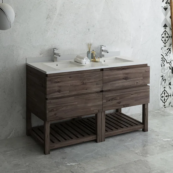 The Fresca Formosa 60" Floor Standing Open Bottom Double Sink Modern Bathroom Cabinet with Top & Sinks is superbly crafted of solid Acacia wood, known for its magnificent beauty and durability. It has a warm grey finish with a hint of brown throughout, and a natural grain that will inject luxurious warmth into any space. A masterpiece of elegance and style, this free-standing cabinet measures 60” in width. With four solid wood, soft-closing dovetail drawers, this bathroom vanity features tons of storage, ideal for keeping a family organized. The solid pine drawers are clear coated and feature a mitered, wrap-around design that adds to the superior detailing. Cove routed pulls are carved directly into the drawers keeping the design sharp and sophisticated. This handsome cabinet also has an open slatted shelf on the bottom, perfect for storing hand towels or other bathroom necessities. Gracing the top of the cabinet is a stunning quartz stone countertop and two ceramic undermount basins. Each white ceramic basin is equipped with an overflow and the countertop has been pre-drilled to accommodate single hole faucets (sold separately). The Fresca Formosa Floor Standing Open Bottom Double Sink Modern Bathroom Cabinet with Top & Sinks is available in multiple sizes and styles. It includes installation hardware.