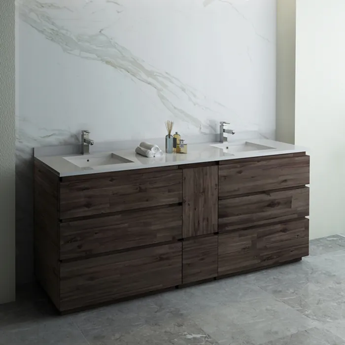 The Fresca Formosa 84” Floor Standing Double Sink Modern Bathroom Cabinet with Top & Sinks is superbly crafted of solid Acacia wood, known for its magnificent beauty and durability. It has a warm grey finish with a hint of brown throughout, and a natural grain that will inject luxurious warmth into any space. A masterpiece of elegance and style, this free standing cabinet measures 84” in width. With large solid wood, soft-closing dovetail drawers beneath each sink, and a roomy cabinet and drawer at the center of the design, this bathroom cabinet features tons of storage, ideal for keeping a family organized. While all drawers provide plenty of space, the bottom drawers are deeper with full storage capacity. The solid pine drawers are clear coated and feature a mitered, wrap-around design that adds to the superior detailing. Cove routed pulls are carved directly into the drawers and cabinet door, keeping the design sharp and sophisticated. Gracing the top of the cabinet is a stunning quartz stone countertop and two ceramic undermount basins. Each white ceramic basin is equipped with an overflow and the countertop has been pre-drilled to accommodate single hole faucets (sold separately). The Fresca Formosa Floor Standing Double Sink Modern Bathroom Cabinet with Top & Sinks is available in multiple sizes and styles. It comes with installation hardware.