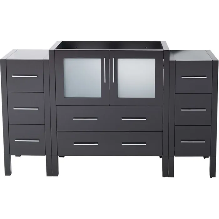 Add a fresh, modern feel to your home with these elegant bathroom cabinets with a chic Espresso finish. With plenty of drawers and a roomy central storage compartment, this stylish combination offers great space to keep bathroom essentials organized. The central unit stands taller than the side units, providing additional visual interest. It features two large soft close drawers and frosted glass panel doors that give this piece a fresh, contemporary feel. The polished chrome pulls are included, adding the perfect finishing touch. Available in the rich finishes of Espresso, Gray Oak, Light Oak or White, the Fresca Torino Modern Bathroom Cabinets are designed to add elegance to any décor. These cabinets measure 54” in width and are available in varies sizes and configurations.