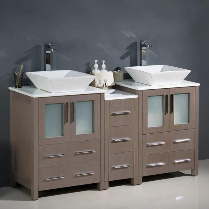Fresca Torino 60 inch Gray Oak Modern Double Sink Bathroom Vanity Cabinets W/ Tops & Vessel Sinks FCB62-241224GO-CWH-V