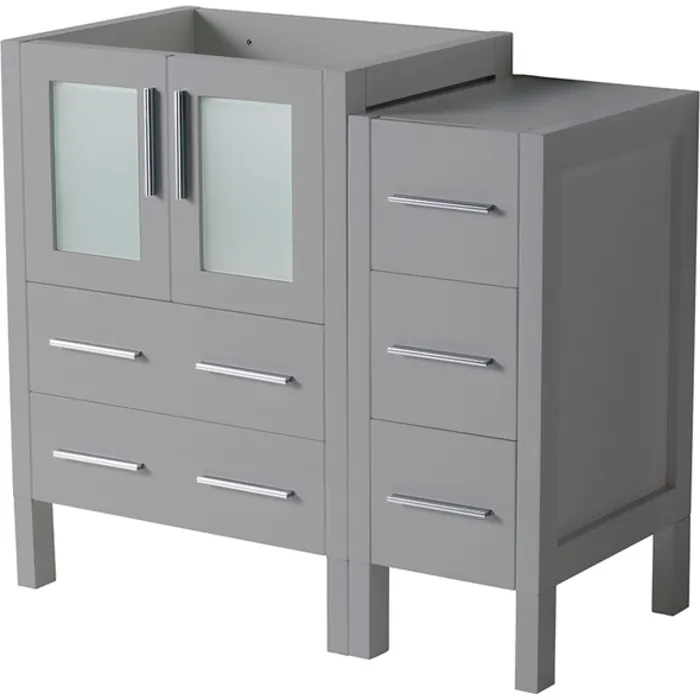 Add a fresh, contemporary touch to your bathroom with this elegant cabinet combination in a rich Gray finish. With soft close drawers and chic doors with frosted glass panels, this distinctive bathroom cabinet configuration really catches the eye. The doors open to reveal great under-the-sink storage space while the sleek side unit features handy drawers that are ideal for keeping daily needs within reach. The polished chrome pulls are included, adding the perfect finishing touch. Available in the rich finishes of Gray, Espresso, Gray Oak, Light Oak or White, the Fresca Torino Modern Bathroom Cabinets are designed to add elegance to any décor. These cabinets measure 36” in width and are available in varies sizes and configurations.