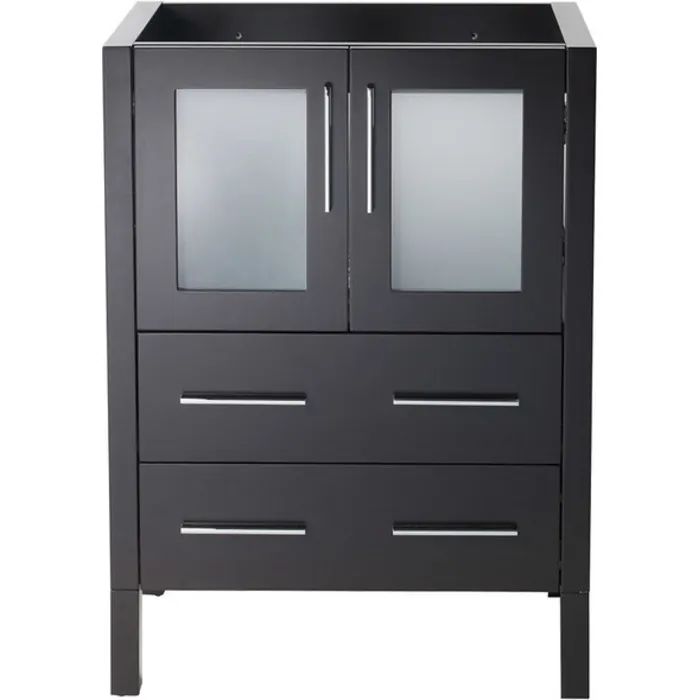 Add a fresh, contemporary touch to your bathroom with this elegant cabinet in a rich Espresso finish. With two soft close drawers and chic doors with frosted glass panels, this stylish bathroom cabinet features clean lines and a smart design. The doors open to reveal great under-the-sink storage space while the drawers are a generous size for holding bathroom essentials. The polished chrome pulls are included, adding the perfect finishing touch. Available in the rich finishes of Espresso, Gray Oak, Light Oak or White, the Fresca Torino Modern Bathroom Cabinet adds elegance to any décor. This particular cabinet is designed to accommodate a counter top that measures 24” in width. It is also available in varies sizes.