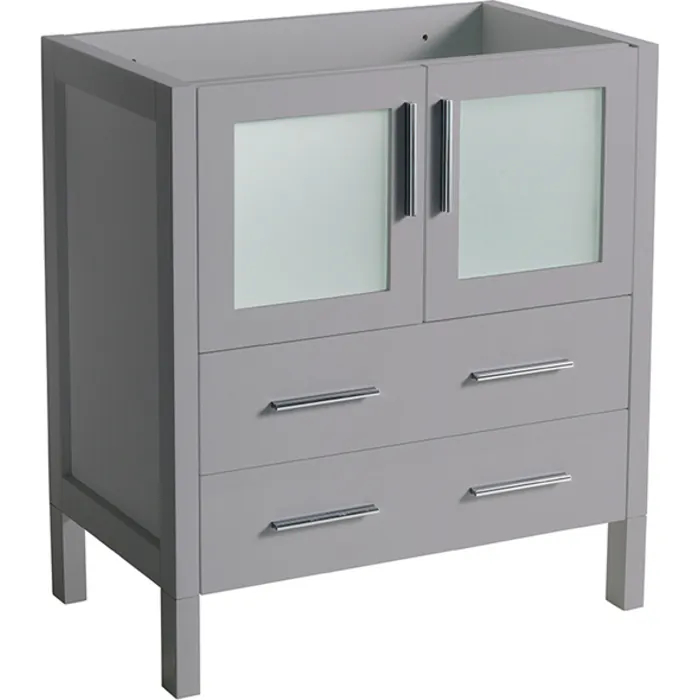 Add a fresh, contemporary touch to your bathroom with this elegant cabinet in a rich Gray finish. With two soft close drawers and chic doors with frosted glass panels, this stylish bathroom cabinet features clean lines and a smart design. The doors open to reveal great under-the-sink storage space while the drawers are a generous size for holding bathroom essentials. The polished chrome pulls are included, adding the perfect finishing touch. Available in the rich finishes of Gray, Espresso, Gray Oak, Light Oak or White, the Fresca Torino Modern Bathroom Cabinet adds elegance to any décor. This particular cabinet is designed to accommodate a counter top that measures 30” in width. It is also available in sizes that can accommodate counter tops measuring 24” and 36”.