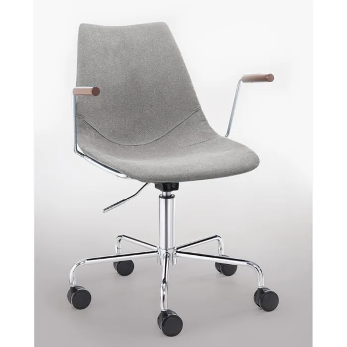 Contemporary task chair with clean lines and very comfortable padded upholstered seat and contrasting stainless steel base. Adjustable seat height; Wood accent. Seat height adjustable from 18-23"