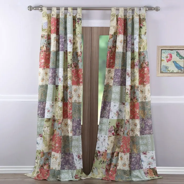 Spreading a riot of garden colors across your bedroom scene, this patchwork tab top panel pair is perfect for any window. 100% Cotton face, back (2 ply). Pocket for up to 3" rod for hanging. Dimensions: Approx. 84" long x 42" wide, with 3" rod pocket and two tie backs. Machine washable. Includes button embellishments.WindowLined for increased sun protectionPatchwork ContructionTab-top panel pair for up to 3" rod for hanging, with button embellishmentsSAFETY TESTED and certified by OEKO-TEX® Standard 100: Tested to be free of 1000+ harmful chemicals and substances – keeping you and your loved ones safe from these threats with our products.Machine washable