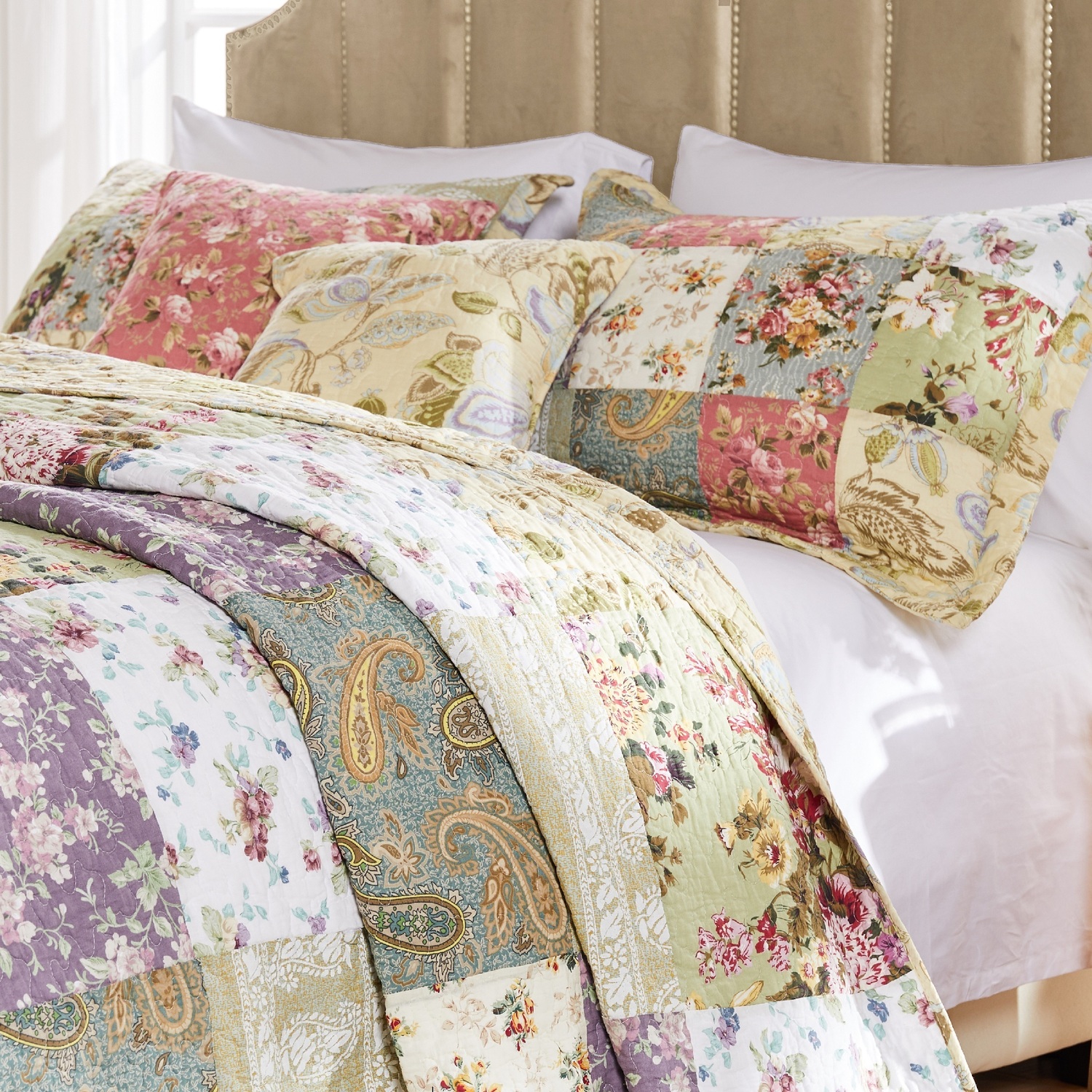 Blooming Prairie spreads a riot of garden colors across your bedroom scene. Each quilted fabric block is carefully assembled, seamed and finished with fabric bound edges. Reverses to an all-over Jacobean print on a soft yellow ground for a truly versatile bed cover. Prewashed and preshrunk. Set includes: Bedspread and two pillow shams (one sham per twin set). Dimensions: Twin set includes one 81x110" bedspread and one 20x26" pillow sham; Full set includes one 96x110" bedspread and two 20x26" pillow shams; Queen set includes one 110x118" bedspread and two 20x26" pillow shams; King set includes one 120x118" bedspread and two 20x36" pillow shams. Bedspread Set100% COTTON face, back and fill - prewashed for extreme comfortWHAT'S INCLUDED: One bedspread and two standard pillow shamsSAFETY TESTED and certified by OEKO-TEX® Standard 100: Tested to be free of 1000+ harmful chemicals and substances – keeping you and your loved ones safe from these threats with our products.NATURAL COMFORT: 100% cotton is prized for natural comfort. Cotton is a breathable and soft material that provides a cozy and inviting sleep environment.Machine washable