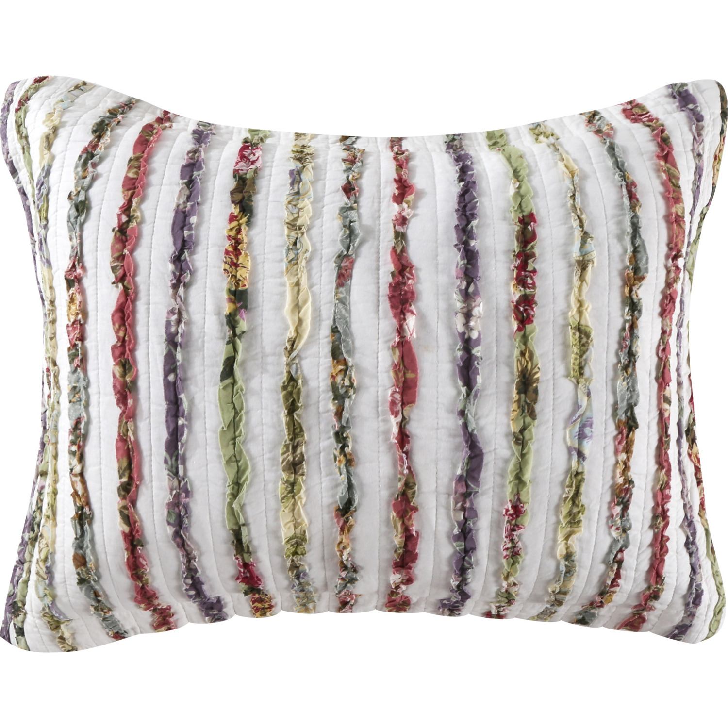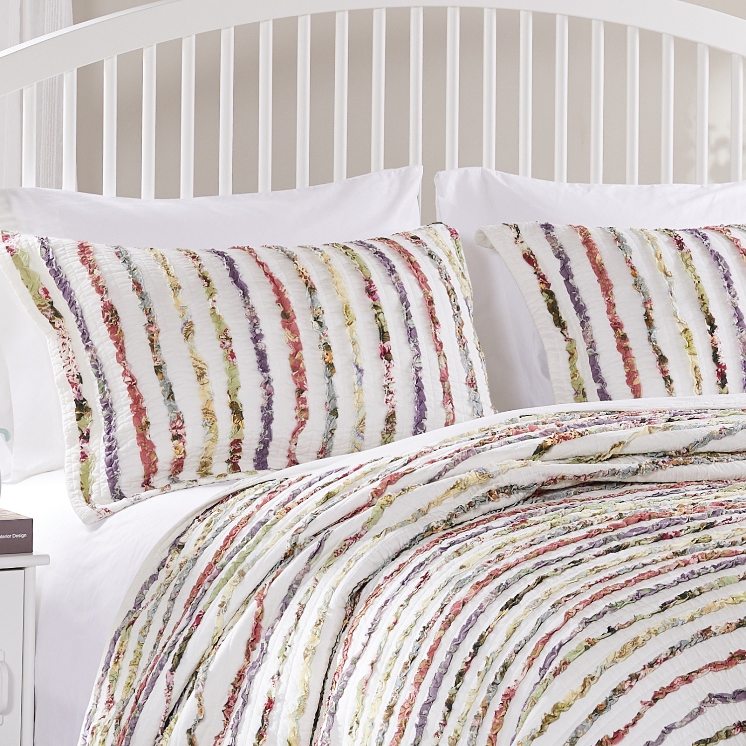 Ruffles of floral printed fabrics are carefully sewn to an off-white ground on the face of this frayed edge quilt, giving it a shabby chic look and feel. Eye-catching yet casual, this romantic style coordinates with a variety of colors matches a wide range of color themes. Oversized for better coverage on today’s deeper mattresses. Cotton face, back and fill. Prewashed and preshrunk. Machine washable. Set includes: Quilt and two pillow shams (one sham per twin set). Dimensions: Twin set includes one 68x88" quilt and one 20x26" pillow sham; Full/Queen set includes one 90x90" quilt and two 20x26" pillow shams; King set includes one 105x95" quilt and two 20x36" pillow shams. Sham100% COTTON face, back and fill - prewashed for extreme comfortWHAT'S INCLUDED: One king-sized pillow shamSAFETY TESTED and certified by OEKO-TEX® Standard 100: Tested to be free of 1000+ harmful chemicals and substances – keeping you and your loved ones safe from these threats with our products.NATURAL COMFORT: 100% cotton is prized for natural comfort. Cotton is a breathable and soft material that provides a cozy and inviting sleep environment.Machine washable