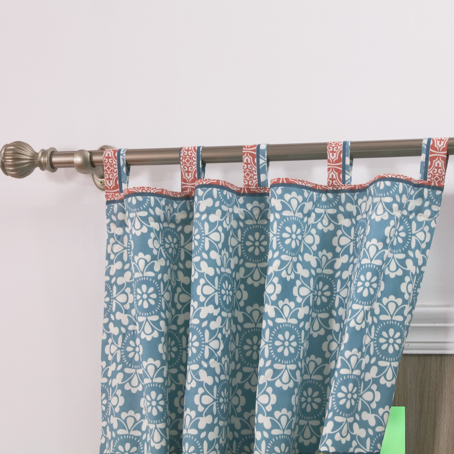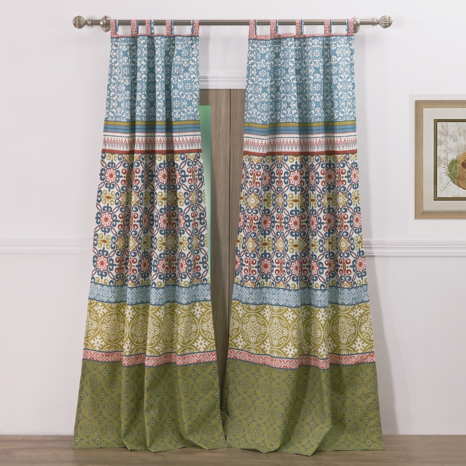 Calming like a remote mountain sanctuary, with geometric patterns in colors that evoke balance and harmony, the Shangri-La panel pair fills your space with tranquility. Dimensions: 84" long x 42" wide (x2). 100% polyester face, back (2 ply). Tab tops for up to 3" rod for hanging. Dimensions: Approx. 84" long x 42" wide each panel, including 3" tab tops. This 4-Piece set includes two panels and two tie backs. Machine washable.WindowGeometric patterns in calming colors that evoke balance and harmony in any room. Lined for increased sun protectionTab-top valance features 3-inch tabs and fits most curtain rods for hangingMachine washable
