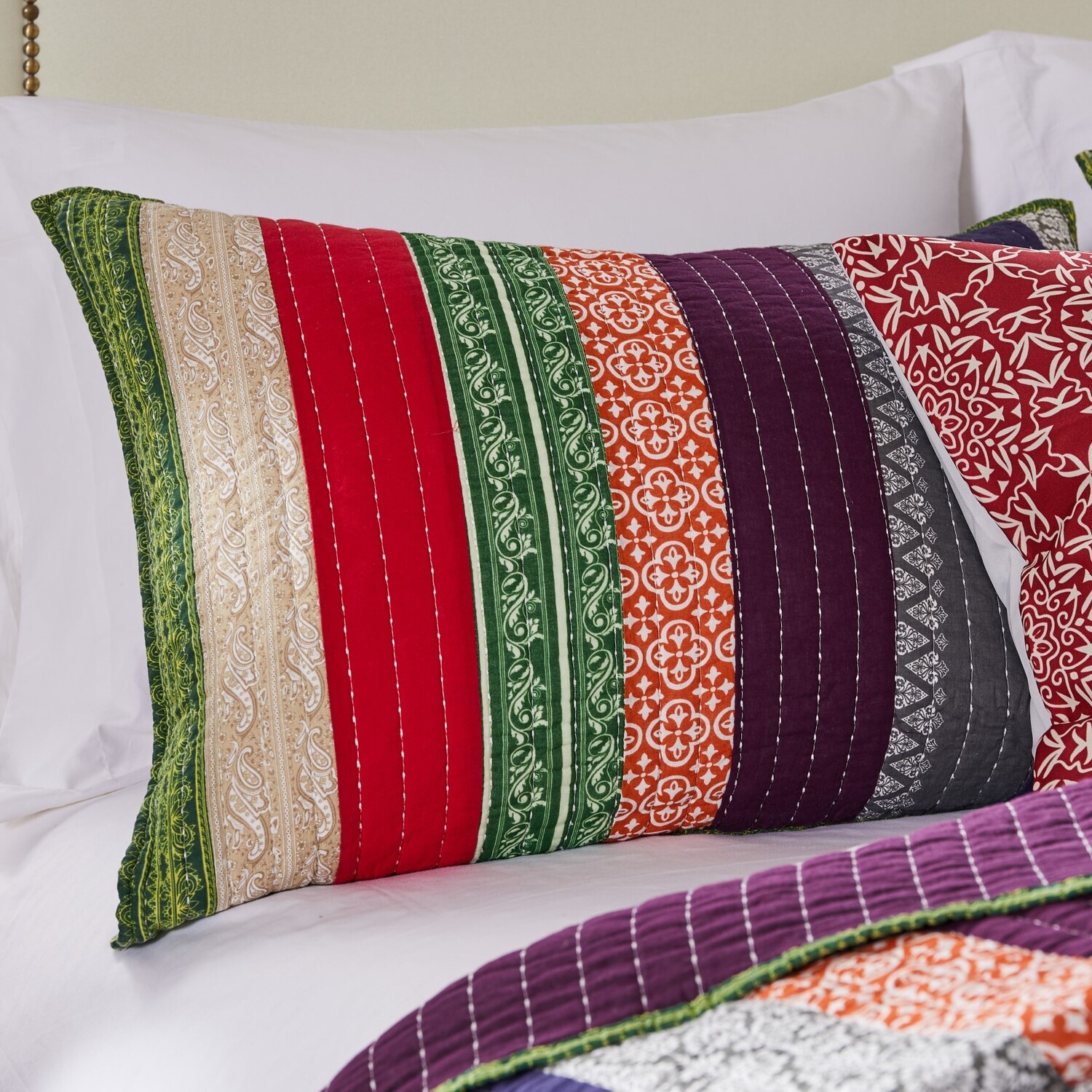 Vibrant stripes and rich texture combine to create a lively mood for your bed. Marley brings together old-world prints and solid colors with kantha style quilting for an eclectic, global vibe. Reverses to a juicy plum color all over. Made from prewashed and preshrunk 100% cotton, each Marley quilted sham is machine quilted with fabric bound edges for durability and surface interest. Dimensions: Standard sham 20x26”, King sham 20x36”. Dimensions +/- 2”. Machine Wash.Sham100% COTTON face, back and fill - prewashed for extreme comfortWHAT'S INCLUDED: One king-sized pillow shamSAFETY TESTED and certified by OEKO-TEX® Standard 100: Tested to be free of 1000+ harmful chemicals and substances – keeping you and your loved ones safe from these threats with our products.NATURAL COMFORT: 100% cotton is prized for natural comfort. Cotton is a breathable and soft material that provides a cozy and inviting sleep environment.Machine washable