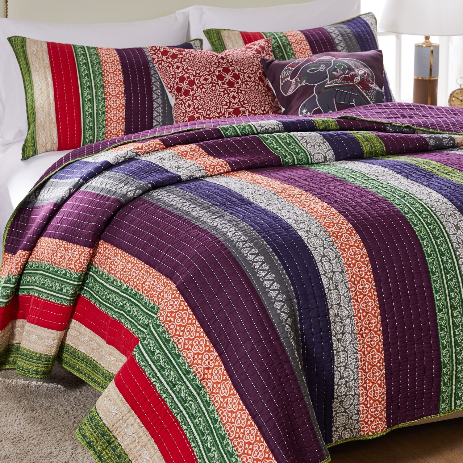 Vibrant stripes and rich texture combine to create a lively mood for your bed. The Marley quilt set brings together old-world prints and solid colors with kantha style quilting for an eclectic, global vibe. Reverses to a juicy plum color all over. Made from prewashed and preshrunk 100% cotton, the Marley quilt is oversized for better coverage on today’s deeper mattresses. Machine quilted with fabric bound edges for durability and surface interest. Quilt set comes with quilt and two pillow shams (one sham per Twin set). Dimensions: Twin set includes one 68x88" quilt plus one 20x26" pillow sham, Full/Queen set includes one 90x90" quilt plus two 20x26" pillow shams, King set includes one 105x95" quilt plus two 20x36" pillow shams. Dimensions +/- 2”. Machine Wash.Quilt Set100% COTTON face, back and fill - prewashed for extreme comfortWHAT'S INCLUDED: One quilt and one standard pillow shamSAFETY TESTED and certified by OEKO-TEX® Standard 100: Tested to be free of 1000+ harmful chemicals and substances – keeping you and your loved ones safe from these threats with our products.NATURAL COMFORT: 100% cotton is prized for natural comfort. Cotton is a breathable and soft material that provides a cozy and inviting sleep environment.Machine washable