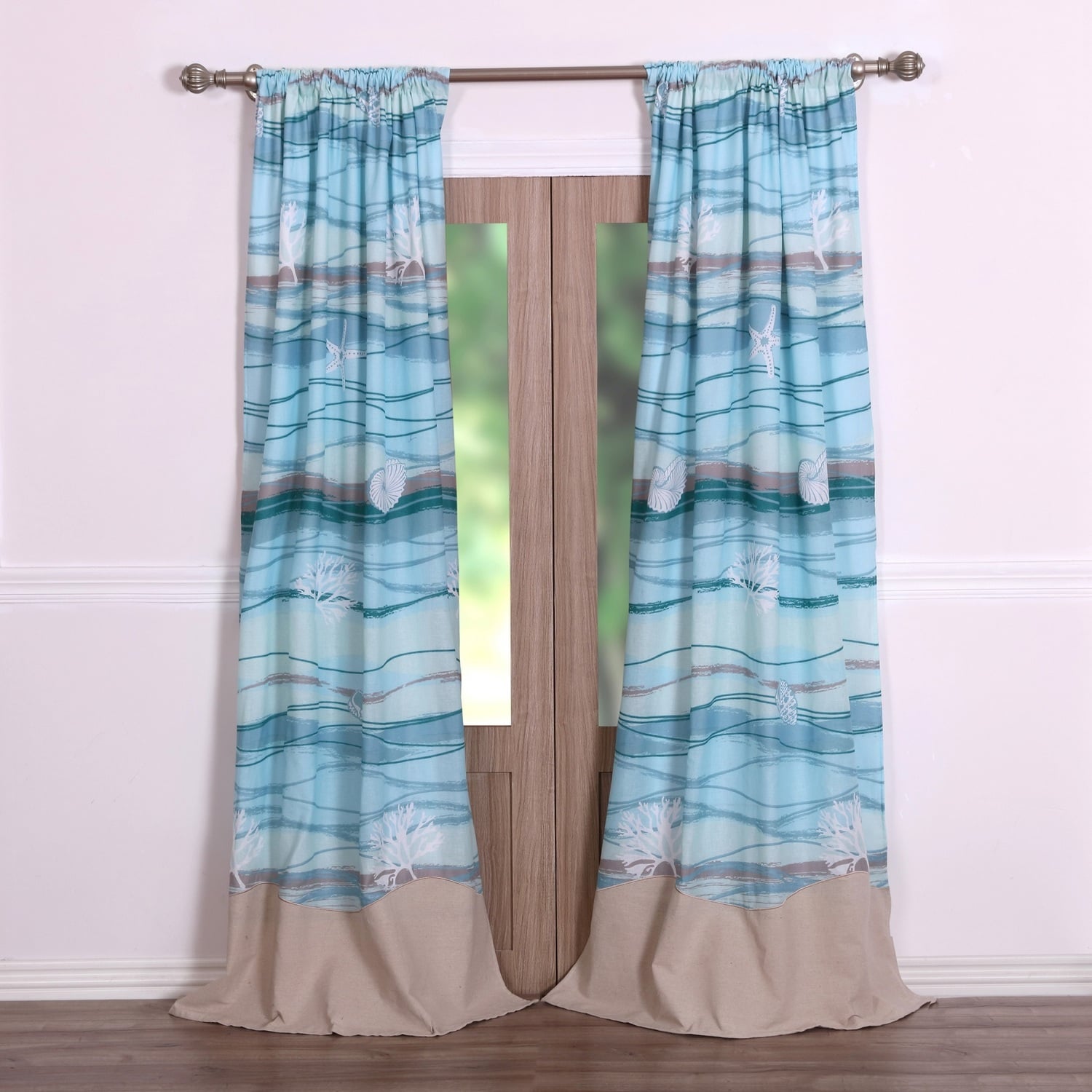 The beach life feels right at home with the Maui curtain panel pair. Awash in turquoise, teal, ocean blue waves and adorned with sea shells and corals, the Maui curtains feature beach sand borders. Each set includes two panels and two tie backs. Three-inch rod pocket along the top accommodates almost any curtain rod for hanging. Lined for increased privacy and sun protection. Dimensions: Each panel measures 42"es wide and 84"es long (x2), for a total window coverage area of 84"es x 84"es. Set includes two tie backs, each three"es wide and 24"es long each. Dimensions +/- 2”. Face fabric is a linen blend, 89% brushed microfiber, 9% cotton, 2% linen. Liner is 100% brushed microfiber. Machine Wash.WindowLined for increased privacy and protection from the sunEach set features two panels and two tie backs.Three-inch rod pocket makes it easy to hang on almost any curtain rodMachine washable