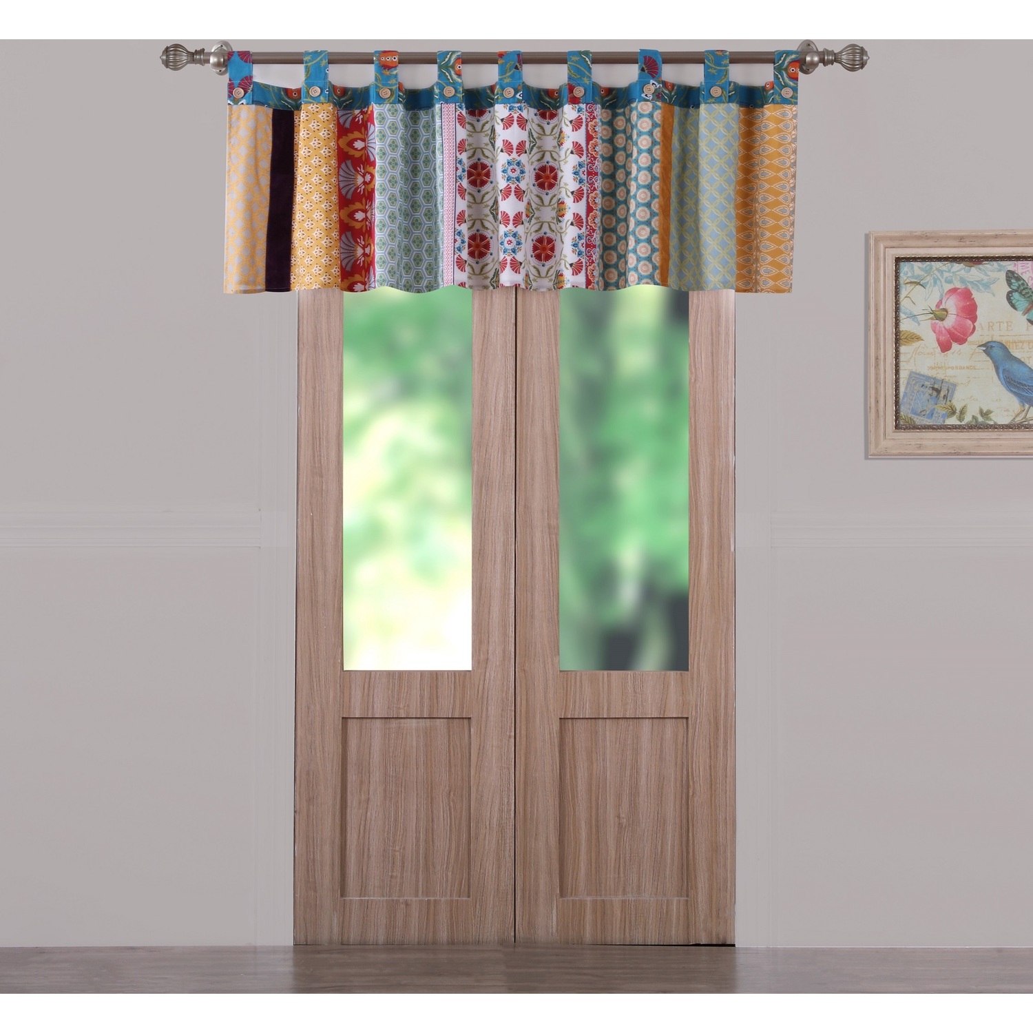Rows of vivid geometric, foulard and floral prints create distinctive bohemian styling. The Geneva valance features the latest fashion colors and multi-fabric construction embellished with velvet bands. This multi-fabric construction tab top valance is perfect for any window. 95% Cotton 5% polyester face, 100% cotton back (2 ply). Tab tops for up to 3" rod for hanging. Dimensions: Approx. 21" long x 84" wide, including 3" tabs for hanging. Machine washable. Includes button embellishments.WindowLined for increased privacy and protection from the sunButton-embellishments on tabs add character.Tab-top valance features 3-inch tabs and fits most curtain rods for hangingMachine washable