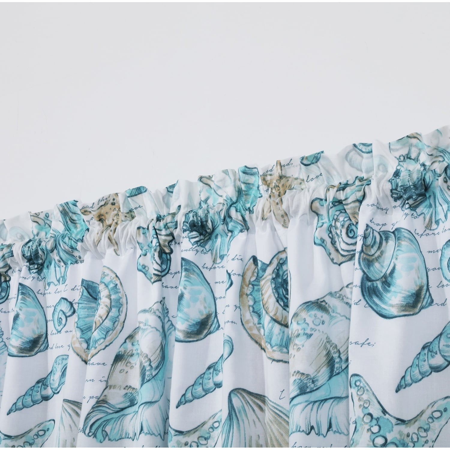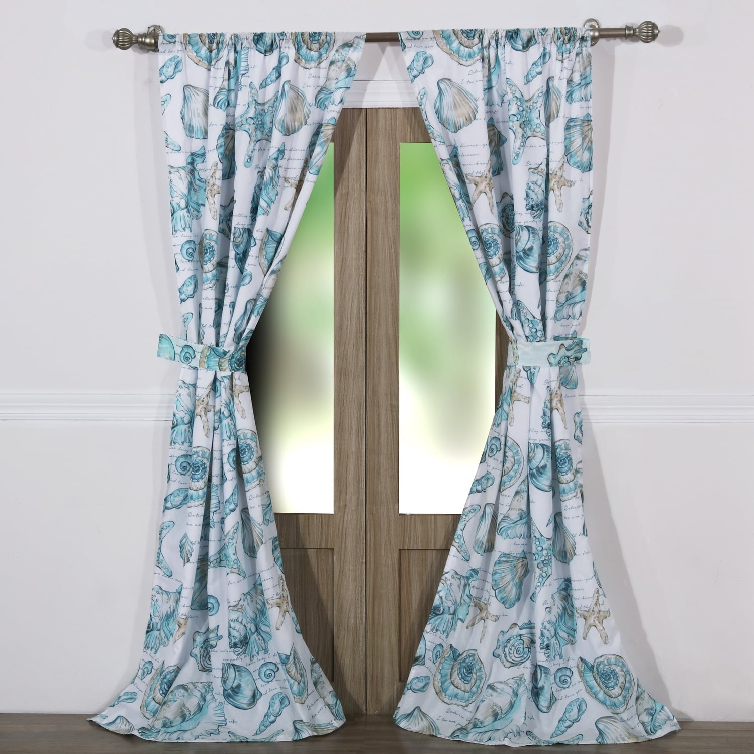 Time for a coastal makeover! Bright beach scenes and fresh ocean breezes are brought to mind with this stunning coastal bedding collection. Cruz offers colorful seashells and dreamy poetic phrases to lull you into a seaside slumber. Colors include turquoise aqua blue, taupe, indigo and gray on an off-white ocean mist background. Lined with solid color fabric for increased privacy and sun protection. This 4-Piece set includes two panels and two tie backs. Dimensions: 84" long x 42" wide (x2). 100% polyester face, back (2 ply). Three-inch rod pocket fits most curtain rods for hanging. Machine wash. Imported. WindowLined for increased privacy and protection from the sunEach set features two panels and two tie backsWide 3-inch rod pocket fits most curtain rodsMachine washable
