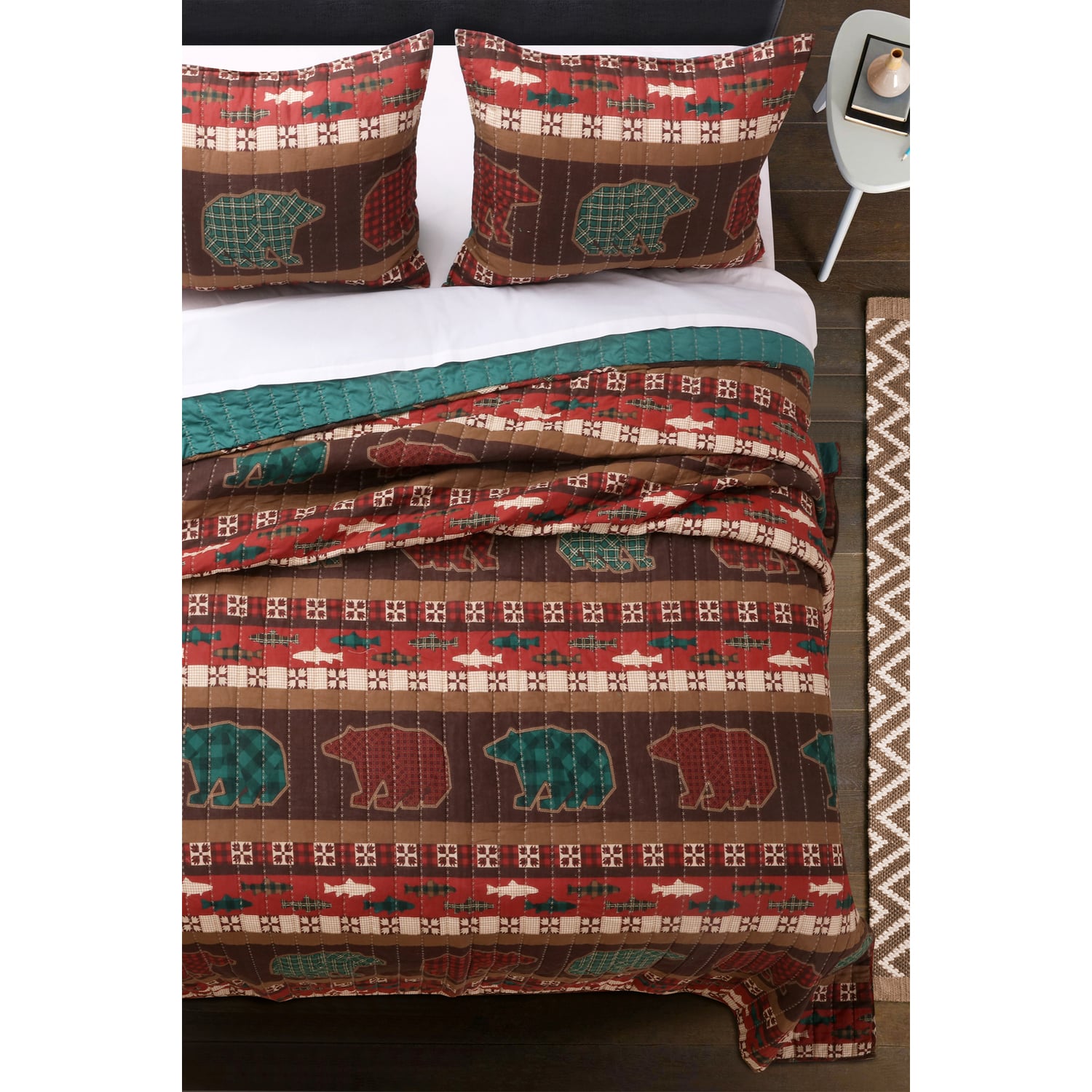 You are not out of the woods yet with this cozy lodge style quilt set! Adding a rustic, backwoods vibe to your space in earth tones of red, rust, forest green and brown, the Canyon Creek bedding set features bear and salmon motifs in traditional plaids and stripes. Reverses to an all-over solid color forest green. Oversized for better coverage on today’s deeper mattresses. Prewashed and preshrunk. Machine quilted with fabric bound edges for durability and surface interest. Quilt set comes with quilt and two pillow shams (one sham per Twin set). Dimensions: Twin set comes with 68x88-inch quilted coverlet, plus one 20x26-inch quilted pillow sham. Full/Queen set comes with one 90x90-inch quilted coverlet, plus two 20x26-inch quilted pillow shams. King set comes with one 105x95-inch quilted coverlet, plus two 20x36-inch quilted pillow shams. All dimensions +/- 2”. 100% Cotton face; 100% microfiber polyester back; Cotton-rich fill is 60% cotton/40% polyester. Machine Wash. Imported.Quilt SetEach set includes quilt and two pillow shams (one sham with twin set).Dimensions: Twin set includes one 68x88-inch quilt and one 20x26-inch pillow sham; Full/Queen set includes one 90x90-inch quilt and two 20x26-inch pillow shams; King set includes one 105x95-inch quilt and two 20x36-inch pillow shams.Reverses to a coordinating solid colorMachine washable