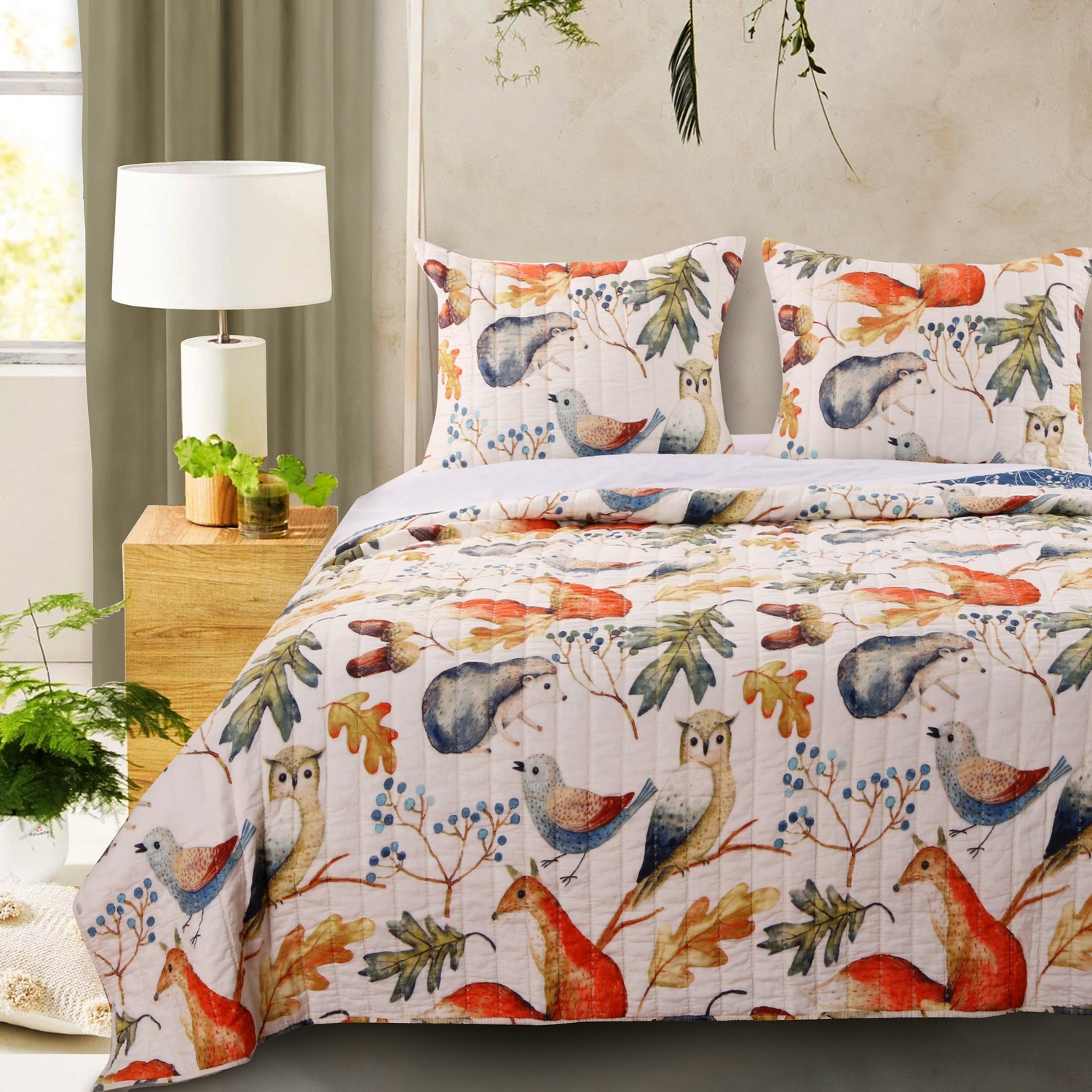 Bring a menagerie of friendly forest creatures into your home. With owls, foxes, hedgehogs and songbirds, the Willow quilt set celebrates a gentle forest kingdom. Reverses to a budding willow print on lake blue. Each set comes with quilt and two pillow shams (one sham with Twin set). Oversized for better coverage on today’s deeper mattresses. Machine quilted with fabric-bound edges for durability. Dimensions: Twin set comes with 68x88-inch quilted coverlet, plus one 20x26-inch quilted pillow sham. Full/Queen set comes with one 90x90-inch quilted coverlet, plus two 20x26-inch quilted pillow shams. King set comes with one 105x95-inch quilted coverlet, plus two 20x36-inch quilted pillow shams. 100% polyester microfiber shell with cotton rich fill. Machine wash. Imported. Quilt SetEach set includes quilt and two pillow shams (one sham with Twin set)Oversized for better coverage on today's deeper mattresses.Reverses to a complementary print for two looks in one!PREWASHED and pre-shrunk for a soft, comfortable feel and a perfect fit right out of the packageMachine washable.