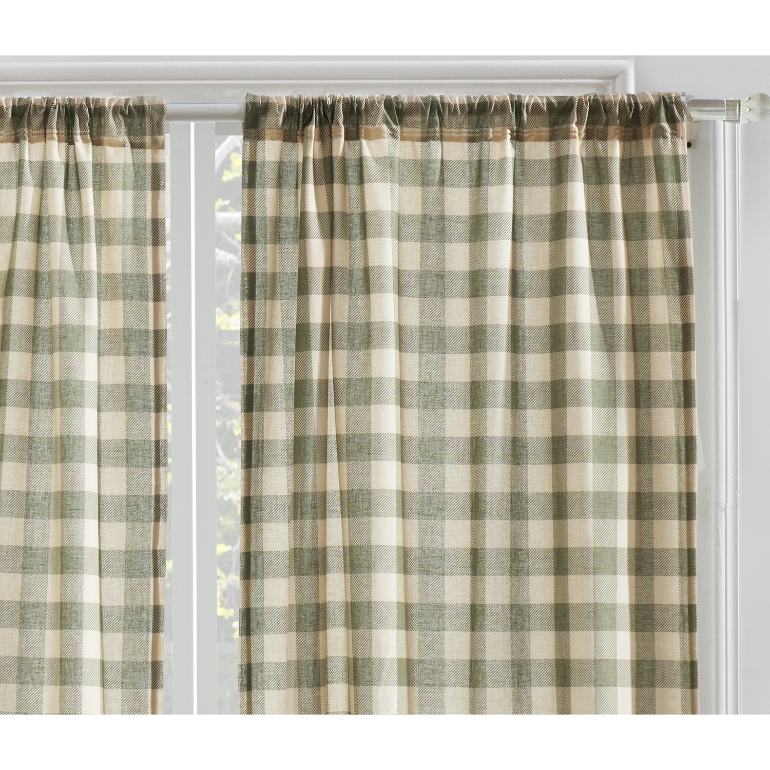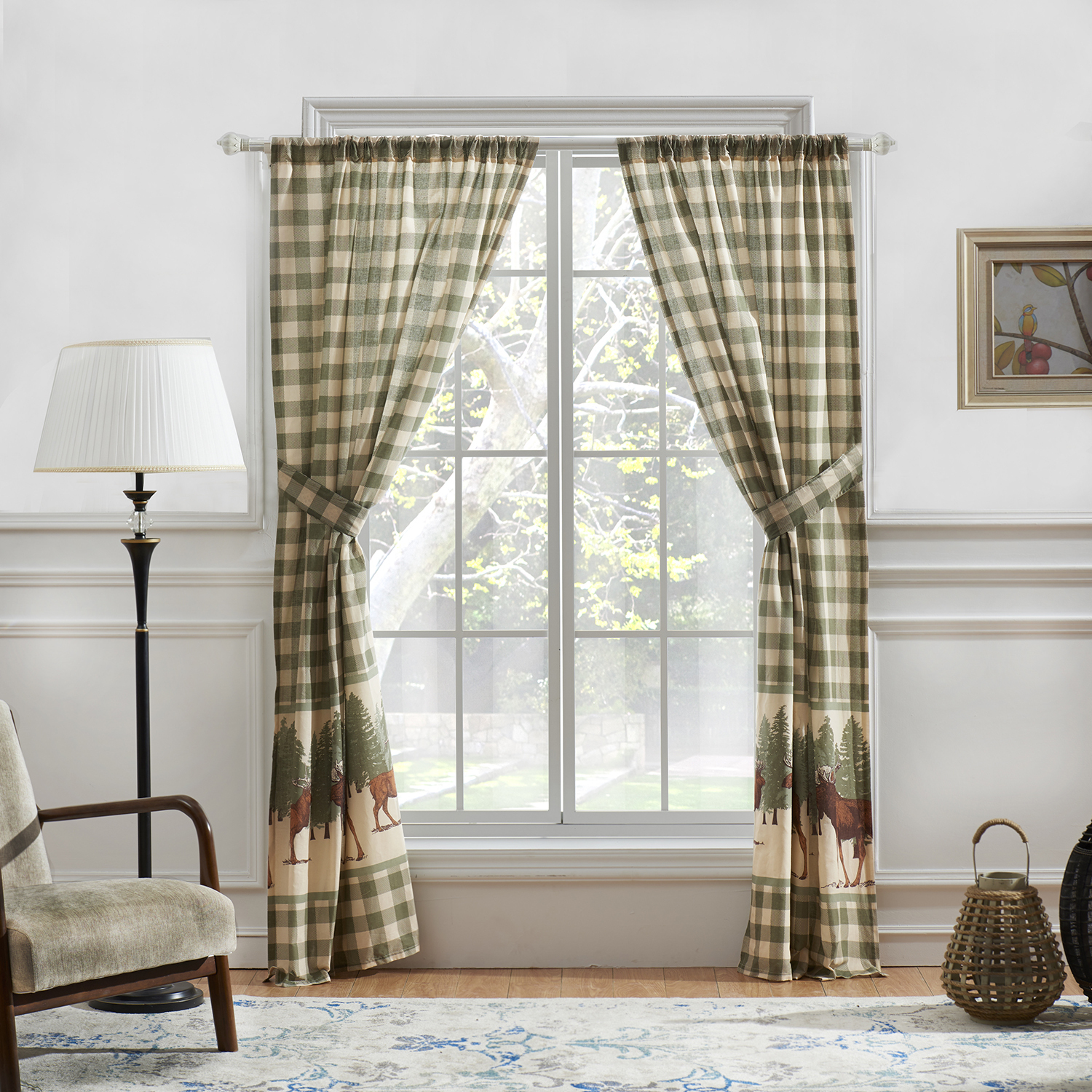 Give your home a warm lake house or lodge style makeover with the Moose Creek panel set. Perfect for the woodsman in his cabin, Moose Creek combines time-honored Buffalo Plaid in green and khaki with amber brown big game elk and moose in a forest landscape. Lined with solid color fabric for increased privacy and sun protection. This 4-Piece set includes two panels and two tie backs. Dimensions: Each panel measures 84"es long x 42"es wide (x2). Overall dimensions of set, 84"es x 84"es. 100% polyester face and back (2 ply). Three-inch rod pocket fits most curtain rods for hanging. Machine wash. Imported. WindowLined for increased privacy and protection from the sunEach set features two panels and two tie backsWide 3-inch rod pocket fits most curtain rodsMachine washable