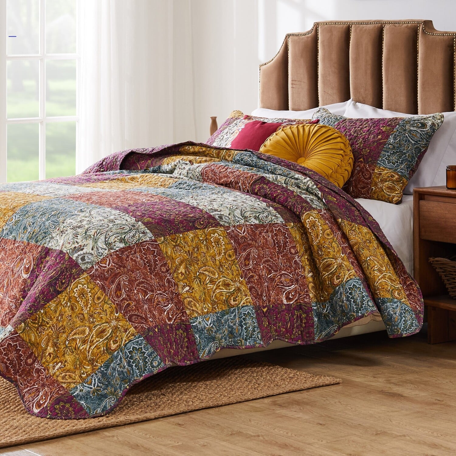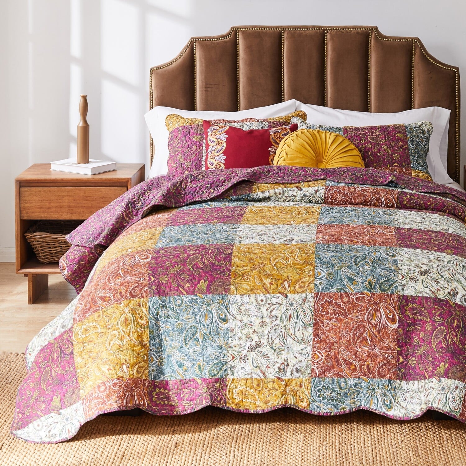 Accent your space with Mid-Century Modern styling. Retro paisley prints in a kaleidoscope of colors lighten the mood and coordinate with a variety of home decor palettes. Quilt set comes with quilt and two pillow shams (one sham per Twin set). Complimentary print on reverse for two looks in one. Zippered side closure on shams make each truly reversible. Oversized for better coverage on today’s deeper mattresses. Machine quilted with fabric bound edges for durability and surface interest. Dimensions: Twin set includes one 68x88-inch quilt and one 20x26-inch pillow sham; Full/Queen set includes one 90x90-inch quilt and two standard 20x26-inch pillow shams; King set includes one 105x95-inch quilt and two 20x36-inch pillow shams. Dimensions, +/- 2-inches. Machine Wash. Quilt and shams are 100% cotton face; 100% microfiber polyester back with cotton rich fill (60% cotton, 40% polyester), prewashed for extra softness and comfort. Quilt SetComplete quilt set comes with quilt and two pillow shams (one sham per Twin set). Oversized for better coverage on today’s deeper mattresses. Dimensions: Twin set includes one 68x88-inch quilt and one 20x26-inch pillow sham; Full/Queen set includes one 90x90-inch quilt and two standard 20x26-inch pillow shams; King set includes one 10Reverses to a coordinate paisley print for two looks in one.PREWASHED and pre-shrunk for a soft, comfortable feel and a perfect fit right out of the packageMachine washable.