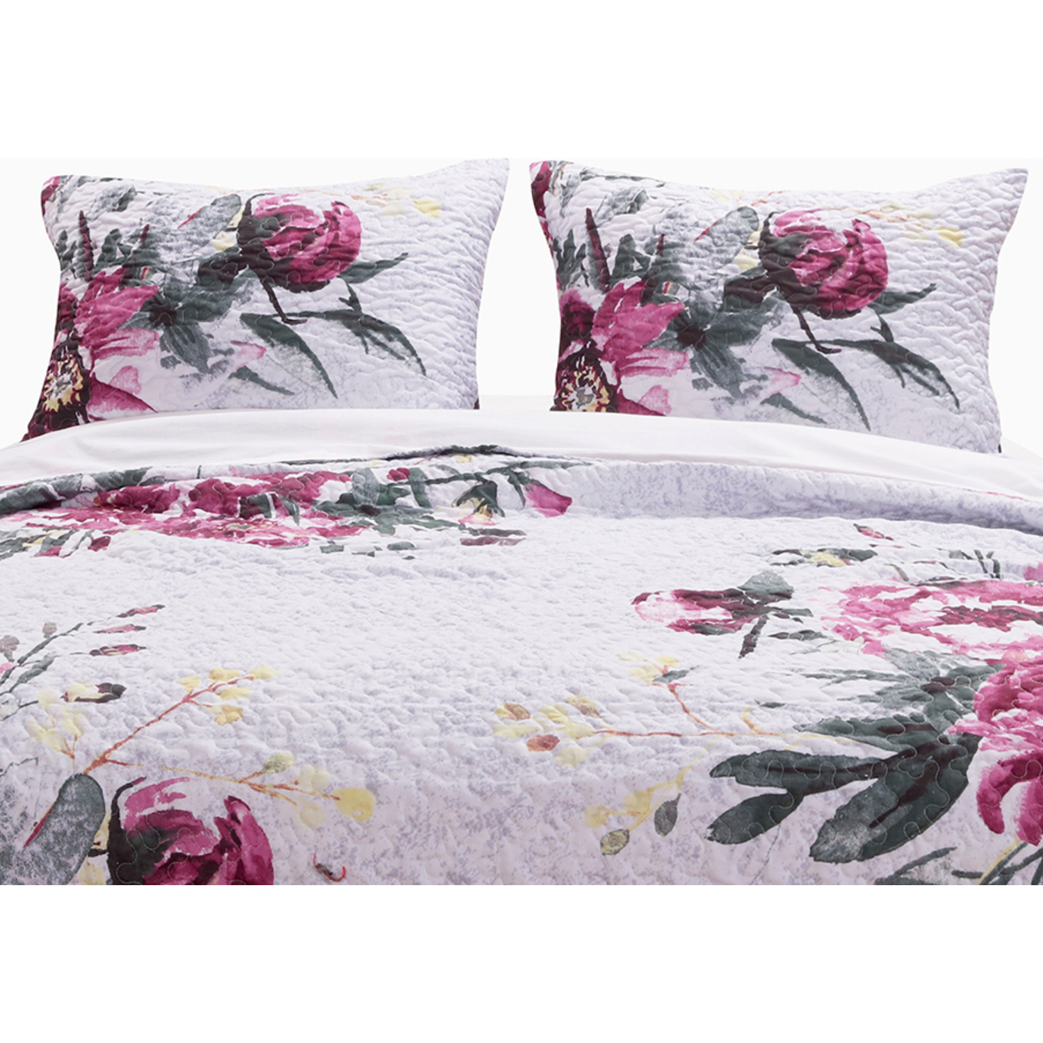 With oversized watercolor brushstroke bouquets of magenta roses on a silvery gray ground the Rose Touch bedding set adds dramatic flair to any room. Reverses to an all-over floral print in coordinate colors on a deep purple ground for two looks in one. Zipper closure to make the sham reversible and to hold your pillow in place . Machine quilted with fabric-bound edges for durability. Dimensions: Standard sham measures 20x26"es; King sham measures 20x36"es. 100% ultra-soft microfiber polyester face; 100% cotton back; 60% cotton 40% polyester cotton-rich fill.ShamDouble down on the look with extra pillow shams!Zipper closure to hold your pillow in place and make it reversibleReverses to a coordinate floral print for two looks in one.PREWASHED and pre-shrunk for a soft, comfortable feel and a perfect fit right out of the packageMachine washable