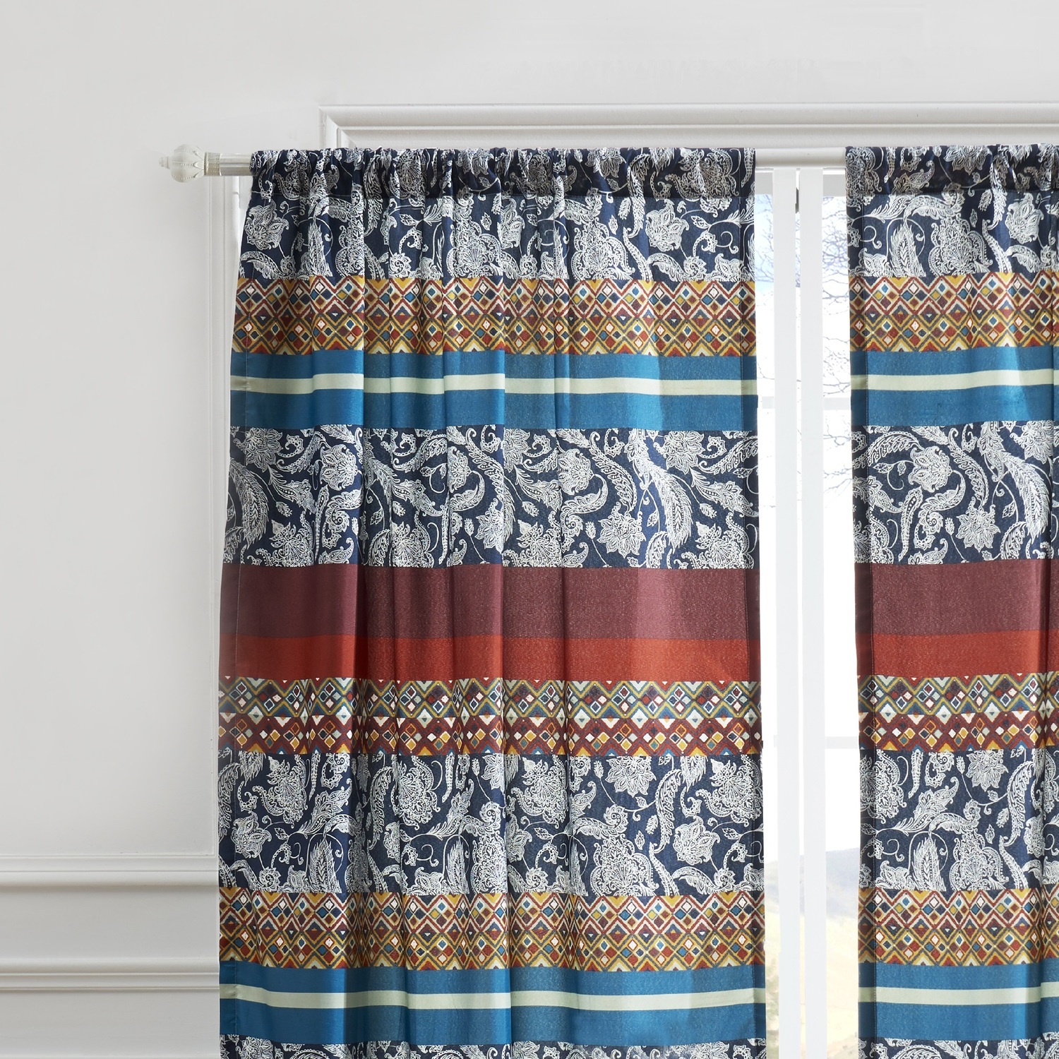 The quirky, eclectic Vista panel set combines rows of bold, saturated colors in deep auburn, indigo, teal and persimmon with corn silk and cloud cream blue. Graphic paisleys and jewel tone mosaic motifs complete the look. Lined with solid color fabric for increased privacy and sun protection. This 4-Piece set includes two panels and two tie backs. Dimensions: Each panel measures 84"es long x 42"es wide (x2). Overall dimensions of set, 84"es x 84"es. 100% polyester face and back (2 ply). Three-inch rod pocket fits most curtain rods for hanging. Machine wash. Imported. WindowLined for increased sun protectionEach set features two panels and two tie backs.Pocket for up to 3" rod for hangingMachine washable