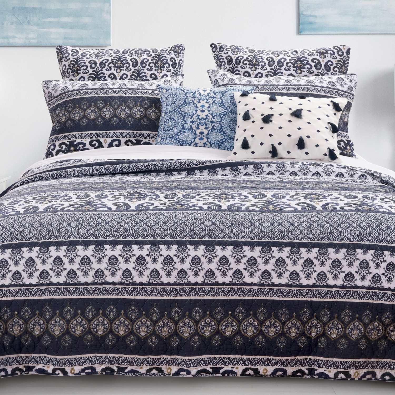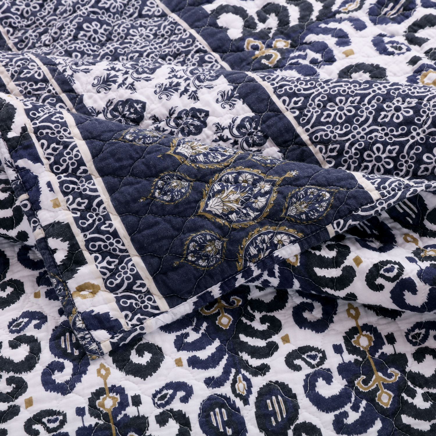 Sleep in tropical Tiki style with the Native bedding set by Barefoot Bungalow! Dreams of idyllic island resorts come to life with waves of ornamental and Ikat motifs in navy, indigo and nomad. Reverses to an all-over coordinate print for two looks in one. Each set comes with quilt and two pillow shams (one sham with Twin set). Oversized for better coverage on today’s deeper mattresses. Machine quilted with fabric-bound edges for durability. Dimensions: Twin set comes with 68x88-inch quilted coverlet, plus one 20x26-inch quilted pillow sham. Full/Queen set comes with one 90x90-inch quilted coverlet, plus two 20x26-inch quilted pillow shams. King set comes with one 105x95-inch quilted coverlet, plus two 20x36-inch quilted pillow shams. 100% polyester microfiber shell with cotton rich fill. Machine wash. Imported. Quilt SetEach set includes quilt and two pillow shams (one sham with Twin set)Dimensions: Twin set includes one 68x88-inch quilt and one 20x26-inch pillow sham; Full/Queen set includes one 90x90-inch quilt and two 20x26-inch pillow shams; King set includes one 105x95-inch quilt and two 20x36-inch pillow shams.Oversized for better coverage on today's deeper mattresses and reversible for two looks in one!Machine washable.