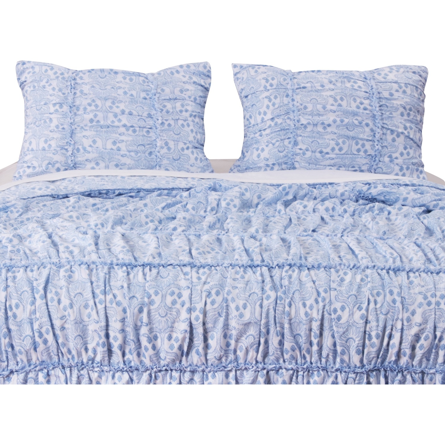 Create a romantic mood with the Helena bedding. Ruffles and gathered tailoring generate loft and relaxed, vintage styling. Whimsical porcelain blue print adds subtle sophistication. Dimensions: Standard sham 20x26-inch, King sham 20x36-inch. Dimensions +/- 2"es. Fabrication: 100% ultra-soft microfiber face, 100% cotton back with 100% polyester fill for extra loft. Machine Wash.ShamDouble down on the look with extra pillow shams!Zipper closure to hold your pillow in placePrewashed and preshrunk for extra softnessMachine washable