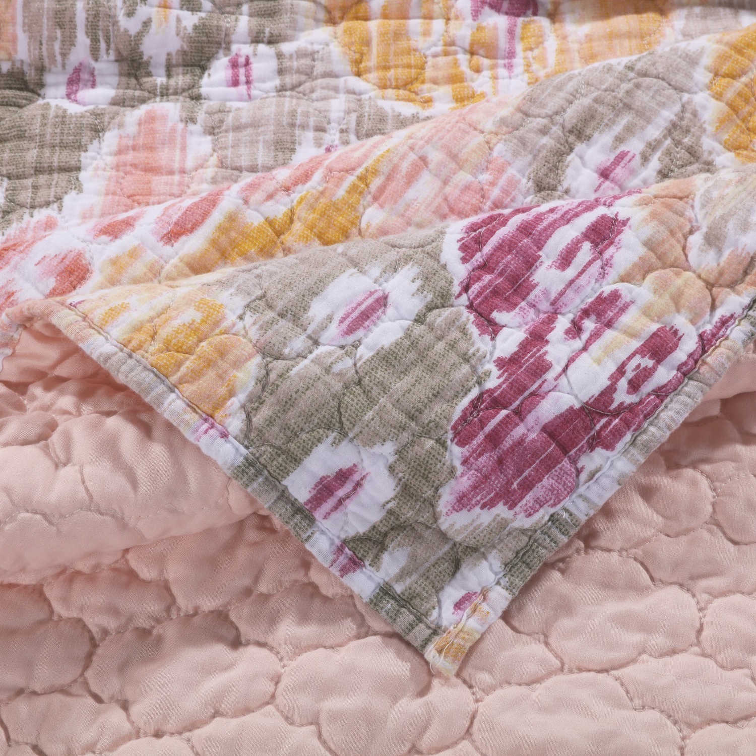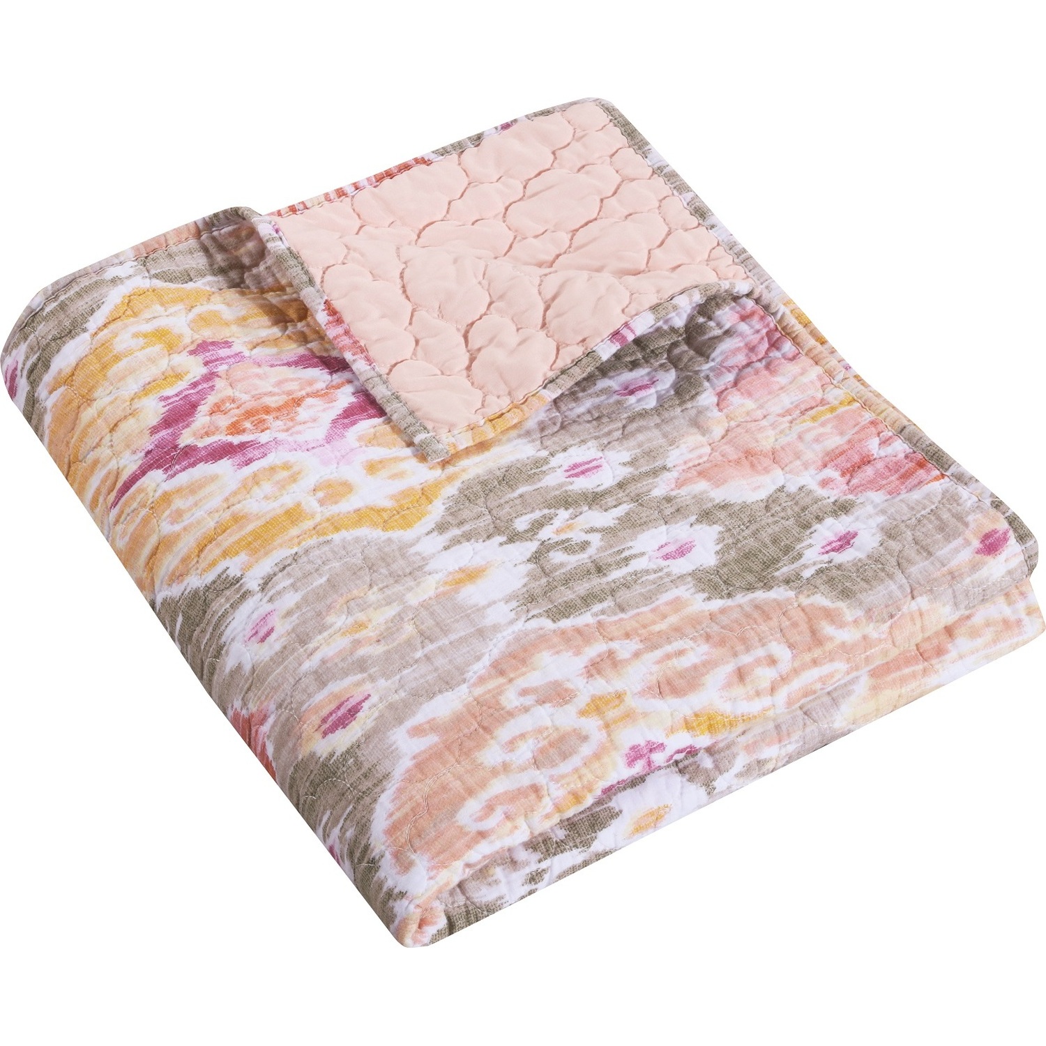 Quirky yet calming, fun yet fashionable, the Ibiza quilted throw brings the best of spring break into your space. With sun-streaked medallions in gold, fuchsia, burgundy, blush and taupe, and reversing to a warm millennial pink, this throw blanket blends in with a variety of interior décor themes. Machine quilted with fabric bound edges for durability and surface interest. Dimensions: 50x60-inches; Dimensions +/- 2-inches. Machine Wash. Prewashed and preshrunk. Fabrication: 100% cotton face; 100% microfiber back with cotton rich fill (60% cotton, 40% polyester), prewashed for extra softness and comfort. AccessoryTime for a modern makeover!The perfect quilt for your cabana or sun chaise.Reverses to a complimentary solid for two looks in one!Machine washable