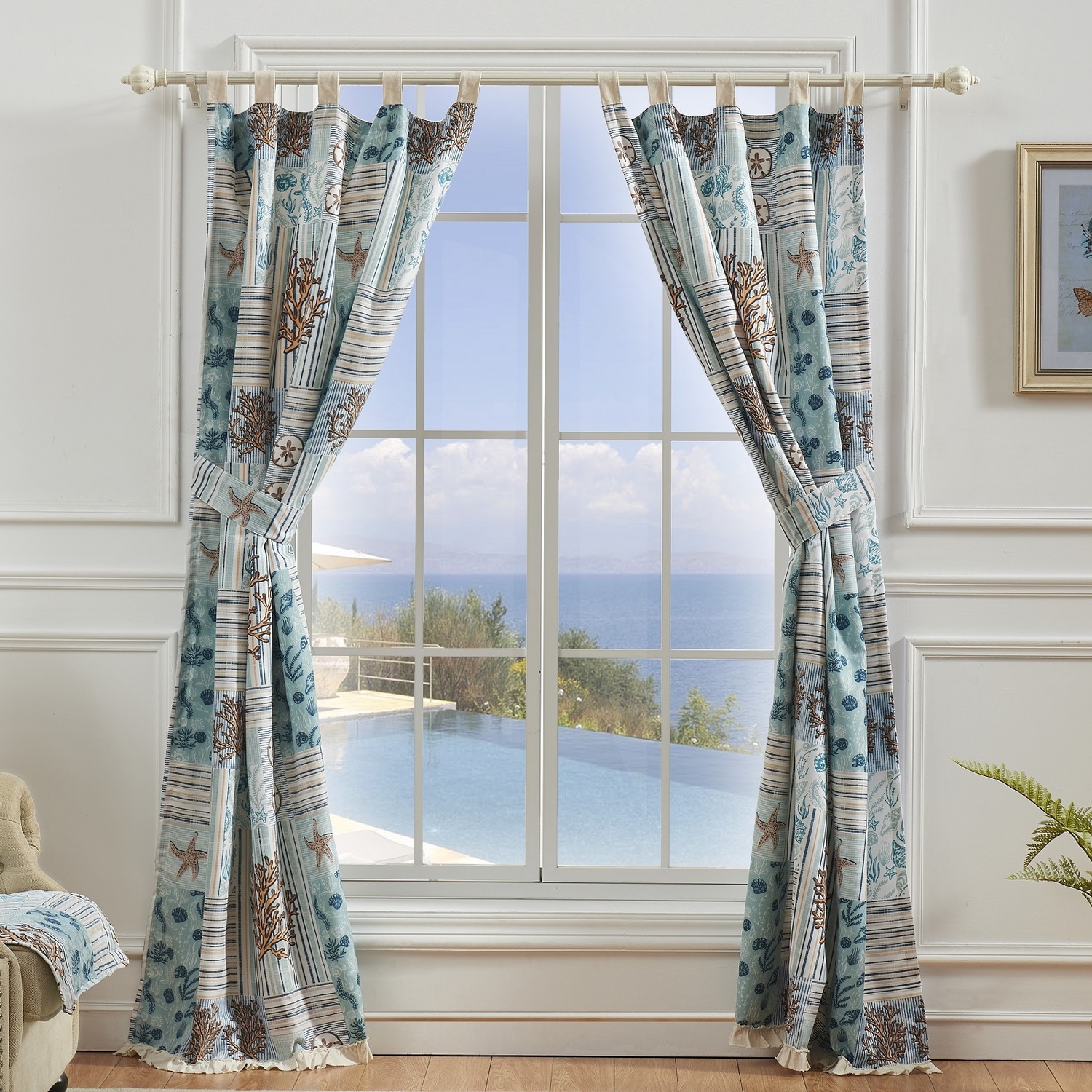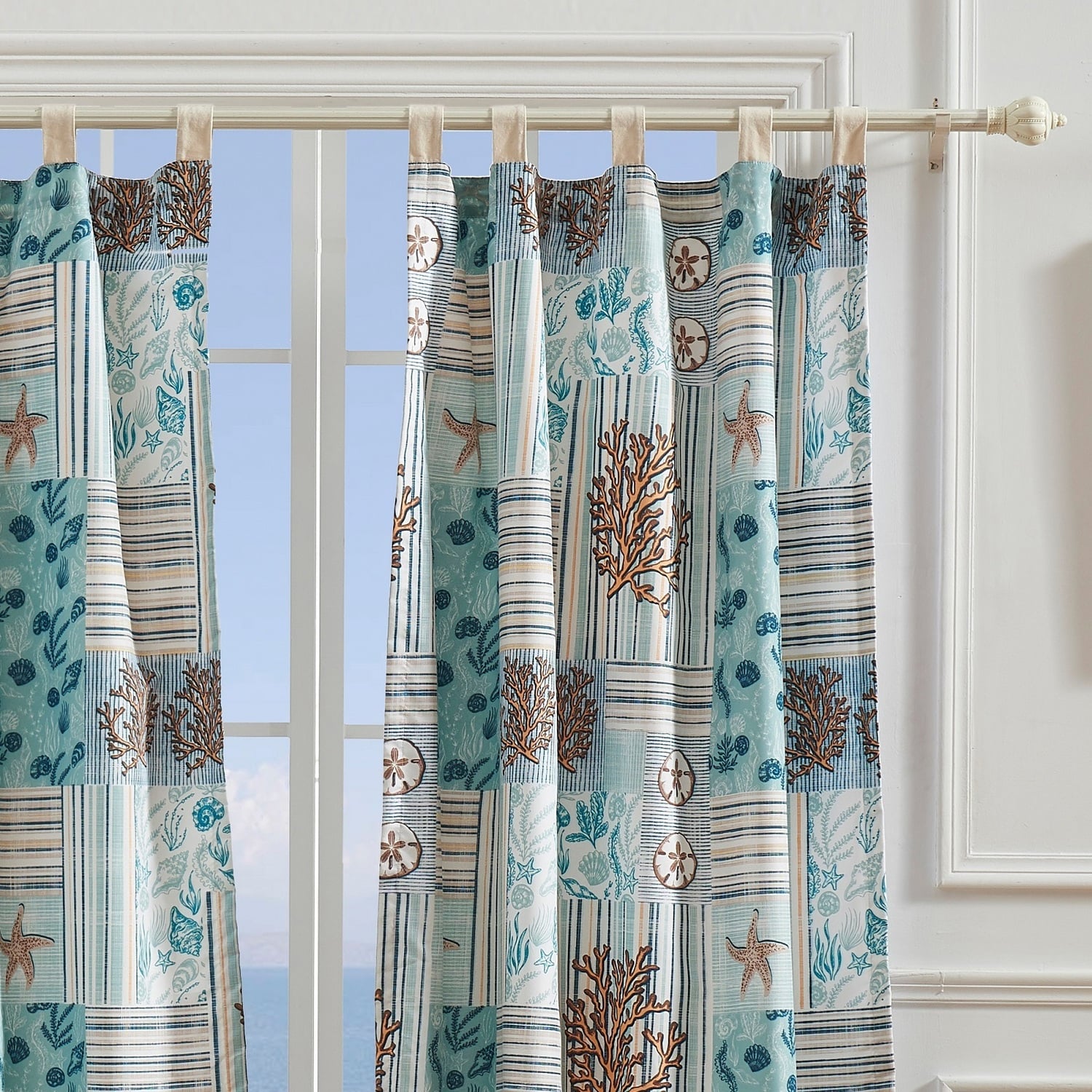 Create a coastal mood in your room with the Key West fringed window treatment. With blocks of sealife and beachy stripes in coral, cream, and seafoam blue, Key West calms any corner of the house. Each curtain panel set is lined with solid color fabric for increased privacy and sun protection, and includes a decorative frayed edge fringe in driftwood taupe. This 4-Piece set includes two panels and two tie backs. Dimensions: Each tab-topped panel measures 84"es long x 42"es wide (x2). Overall dimensions of set, 84"es x 84"es. 100% microfiber face with solid color microfiber polyester back (2 ply), with a cotton/rayon blend fringe along the bottom. Three-inch looped tab at top fit most curtain rods for hanging. Machine washable.WindowLined for increased privacy and protection from the sunEach 4-Piece set features two panels and two tie backsTabs for up to 3" rod for hangingMachine washable