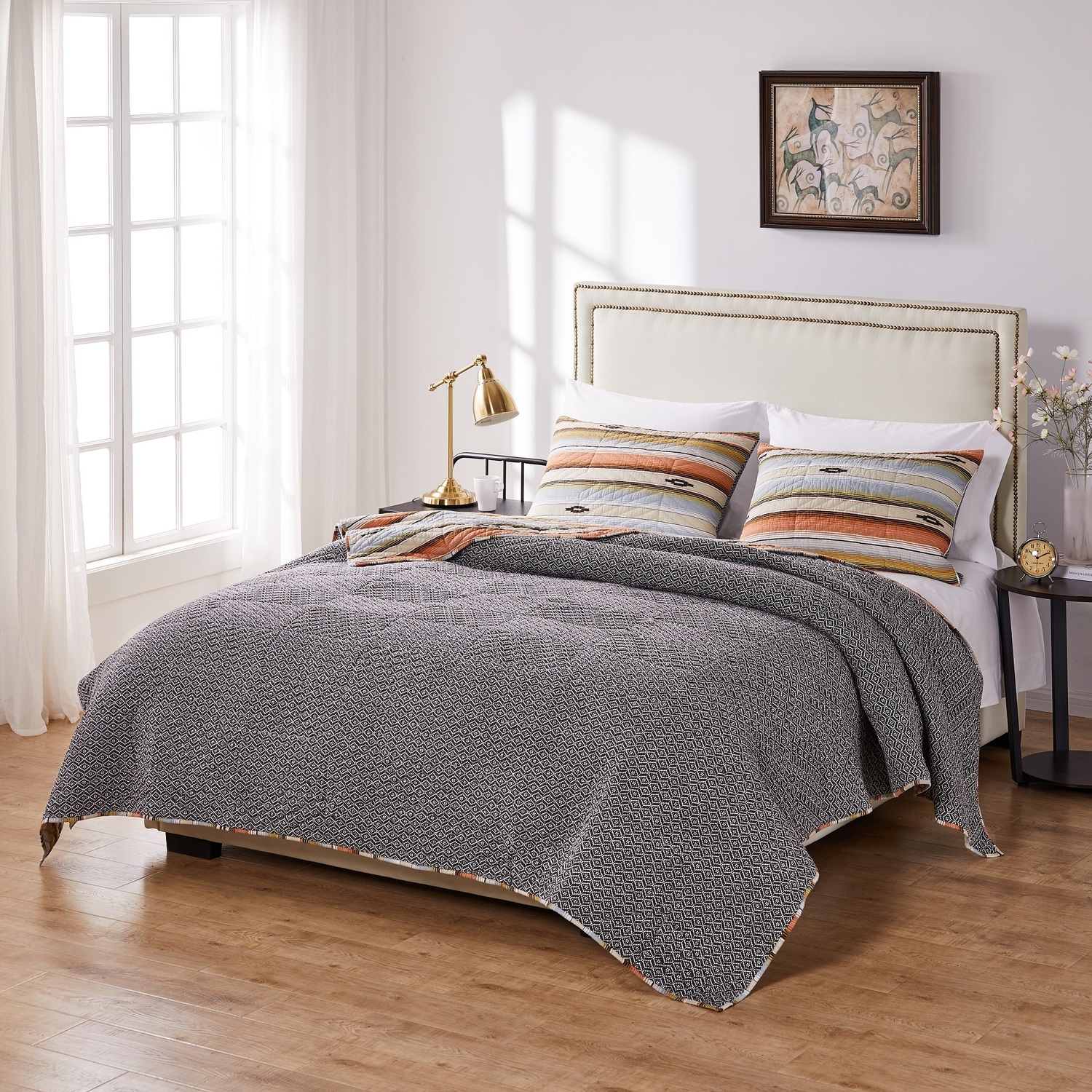 Bring home Southwestern styling at its most refined! Sage and desert rose stripes against a natural sand ground are embellished with thunderbird motifs and geometric chevron quilting. Painted Desert offers the simple sophistication of Southwest style to transform your space with rustic flair. Colors include charcoal, millennial pink and green on a natural linen ground. Reverses to a complimentary geometric print in coffee bean brown. Decorative quilting enhances the durability of each piece. Oversized for better coverage on today's deeper mattresses and reversible for the versatility of two looks in one. Quilt set comes with quilt and two pillow shams (one sham per Twin set). Dimensions: Twin set includes one 68x88-inch quilt plus one 20x26-inch pillow sham, Full/Queen set includes one 90x90-inch quilt plus two 20x26-inch pillow shams, King set includes one 105x95-inch quilt plus two 20x36-inch pillow shams. Dimensions +/- 2"es. 100% Microfiber polyester face and back; 100% Polyester fill. Machine Wash. Imported.Quilt SetEach set comes with quilt plus two pillow shams (one sham with twin set).Dimensions: Twin set includes one 68x88-inch quilt plus one 20x26-inch pillow sham, Full/Queen set includes one 90x90-inch quilt plus two 20x26-inch pillow shams, King set includes one 105x95-inch quilt plus two 20x36-inch pillow shams. Dimensions +/- 2Oversized for better coverage on today's deeper mattressesPREWASHED and pre-shrunk for a soft, comfortable feel and a perfect fit right out of the packageMachine washable