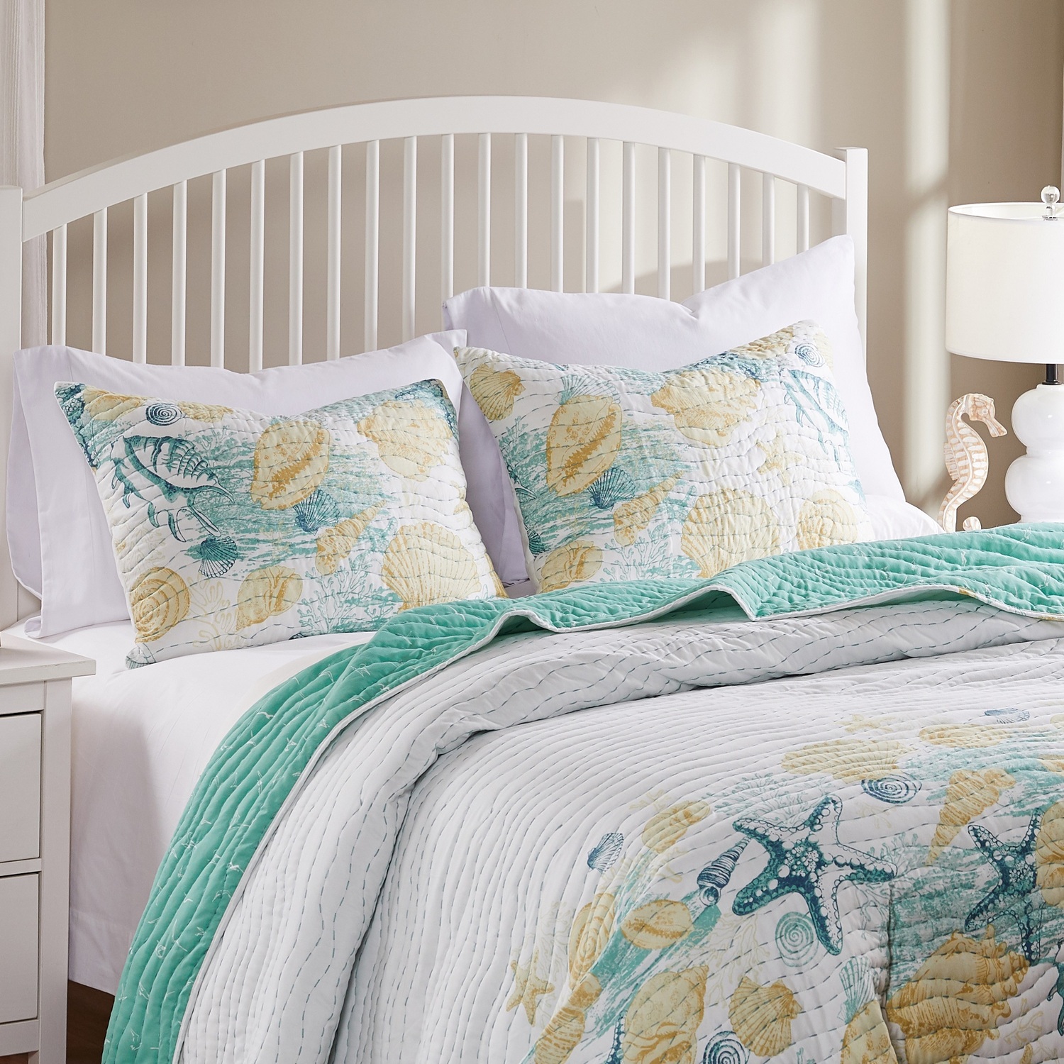Create relaxed beach resort style with the Grand Bahama quilted pillow sham. Seafoam green and gold seashells are washed ashore against an alabaster white ground. Rippling waves of decorative kantha-style quilting complete the look. Reverses to a complimentary print of seagulls wheeling against a seafoam sky. Prewashed with extra softener for unparalleled comfort. Machine quilted with fabric bound edges for durability and surface interest. Zippered side closure makes these shams truly reversible. 100% microfiber face and back with 100% polyester fill. Dimensions: Standard sham measures 20x26". King sham measures 20x36". Machine Wash.ShamDouble down on the look with extra pillow shams!Zippered side closure on sham holds your pillow in place and makes each sham truly reversibleReverses to a coordinate seagull print on a seafoam green groundMachine washable