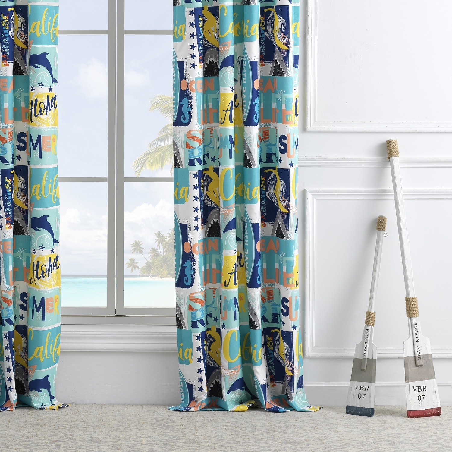 When you have to crash, do it on the beach! The Wave Rider curtain panel pair brings big wave surf adventures home. Summer fun beach art in shades of blue and gray dominate the scene with colorful pops of warm yellow and coral. Each curtain panel set is lined with solid color fabric for increased privacy and sun protection. This 4-Piece set includes two panels and two tie backs. Dimensions: Each panel measures 84"es long x 42"es wide (x2). Overall dimensions of set, 84"es x 84"es. 100% polyester face, back (2 ply). Three-inch rod pocket fits most curtain rods for hanging. Machine wash. WindowEach set includes two panels and two tie backs for generous coverage on any windowEach panel measures 42"es wide x 84"es long making the total coverage area of this panel set, 84"es x 84"es.Lined for increased privacy and sun protection, with a 3-inch rod pocket that fits most rods for hangingMachine washable