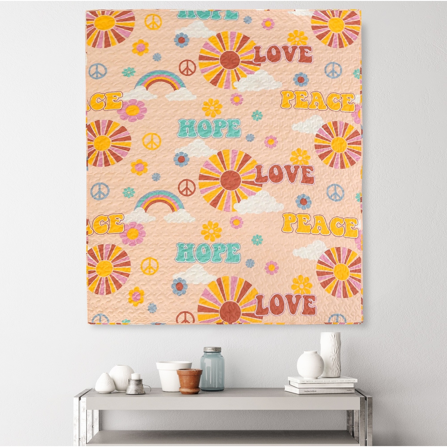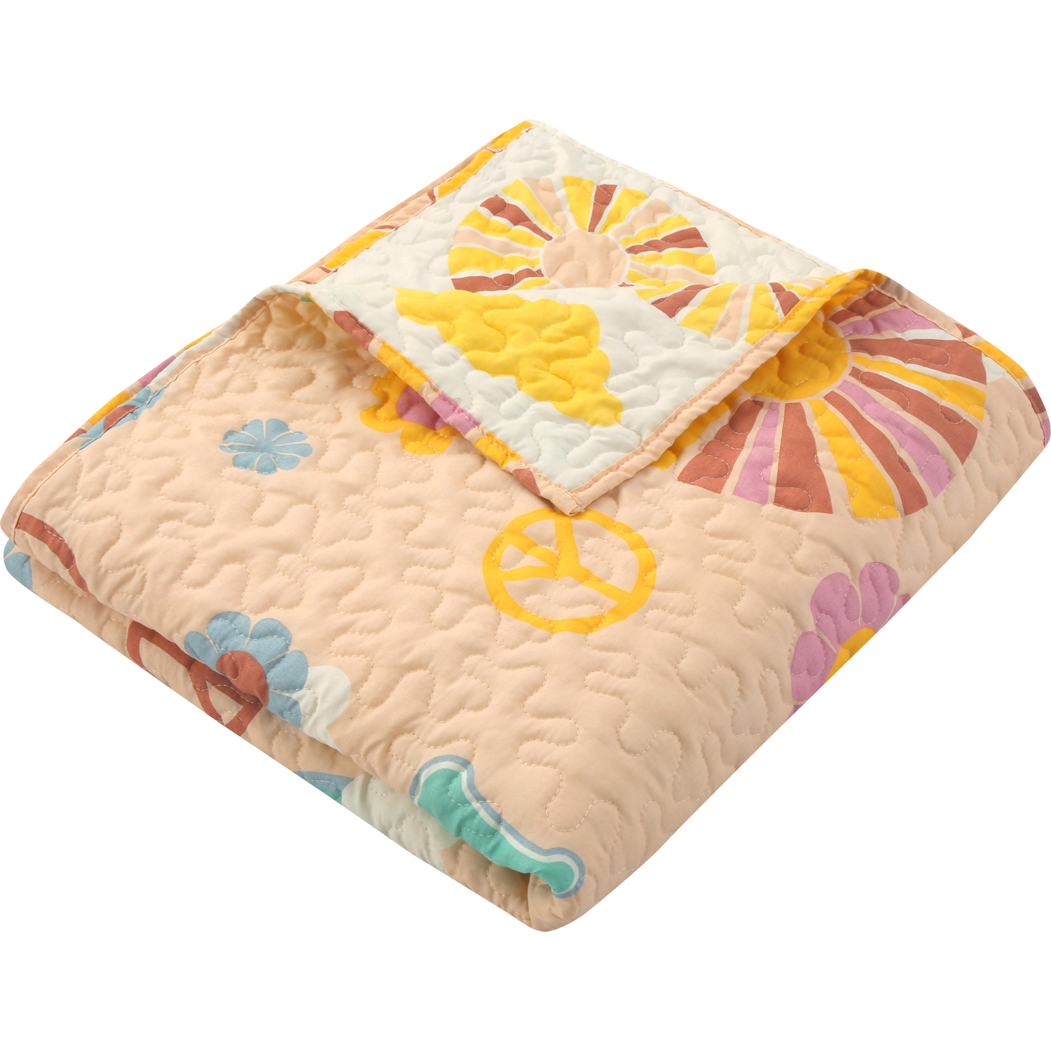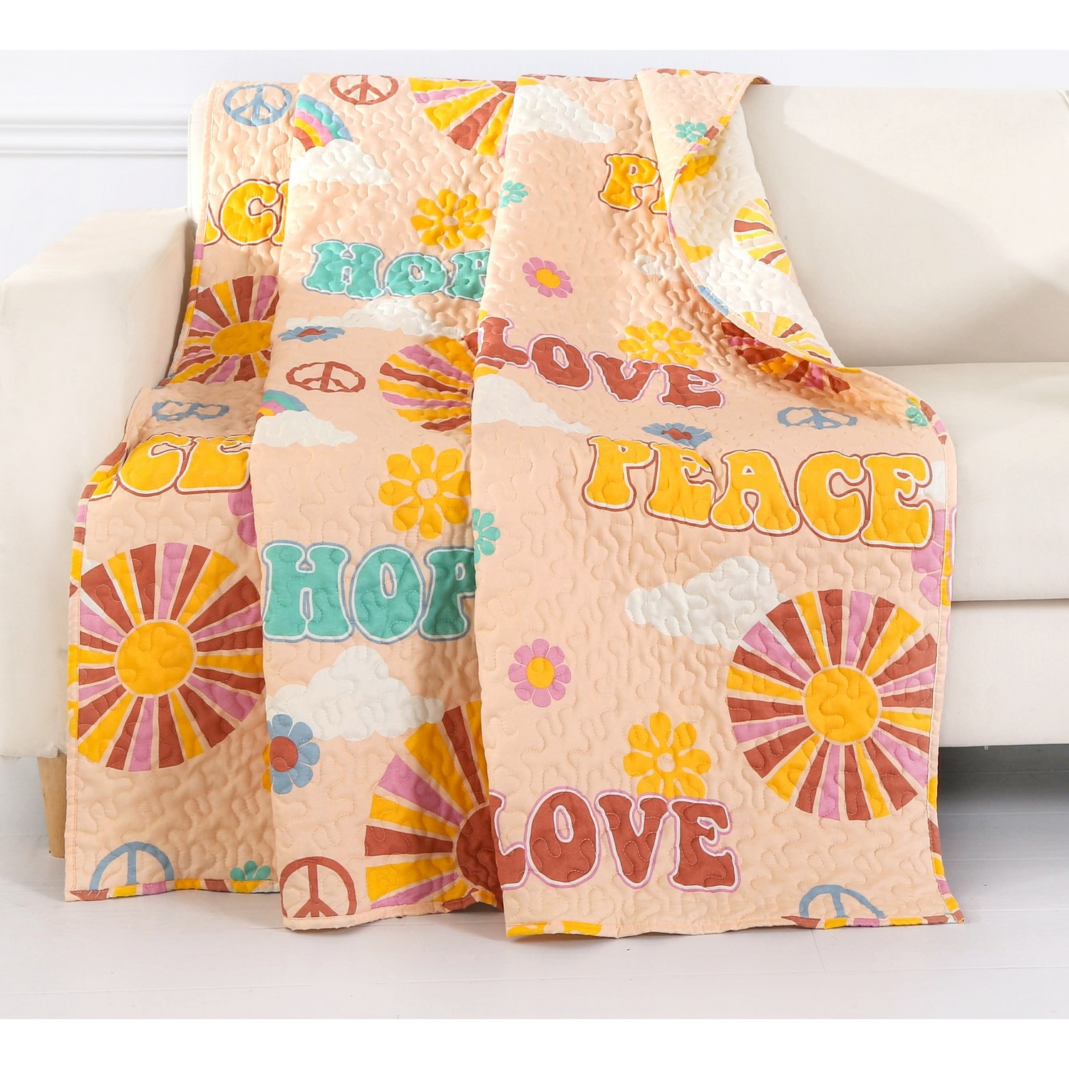 Peace, Hope and Love never go out of style! In a throwback to the '70's, the Cassidy quilted throw blanket features rainbows, peace signs, flowers and clouds floating in a peach blossom sky. The flip side reveals colorful sundiscs and clouds in groovy gold, maroon, peach and white. Prewashed with extra softener for unparalleled comfort. Machine quilted with fabric bound edges for durability and surface interest. Dimensions: 50x60” (+/- 2”). 100% Microfiber polyester face and back; 100% Polyester fill. Machine Wash.AccessoryThis throw blanket measures 50"es x 60"esThe perfect quilt for your beanbag or futon - also makes a great layering piece on your bed.Prewashed with extra softener for a sensation you can relax underMachine washable