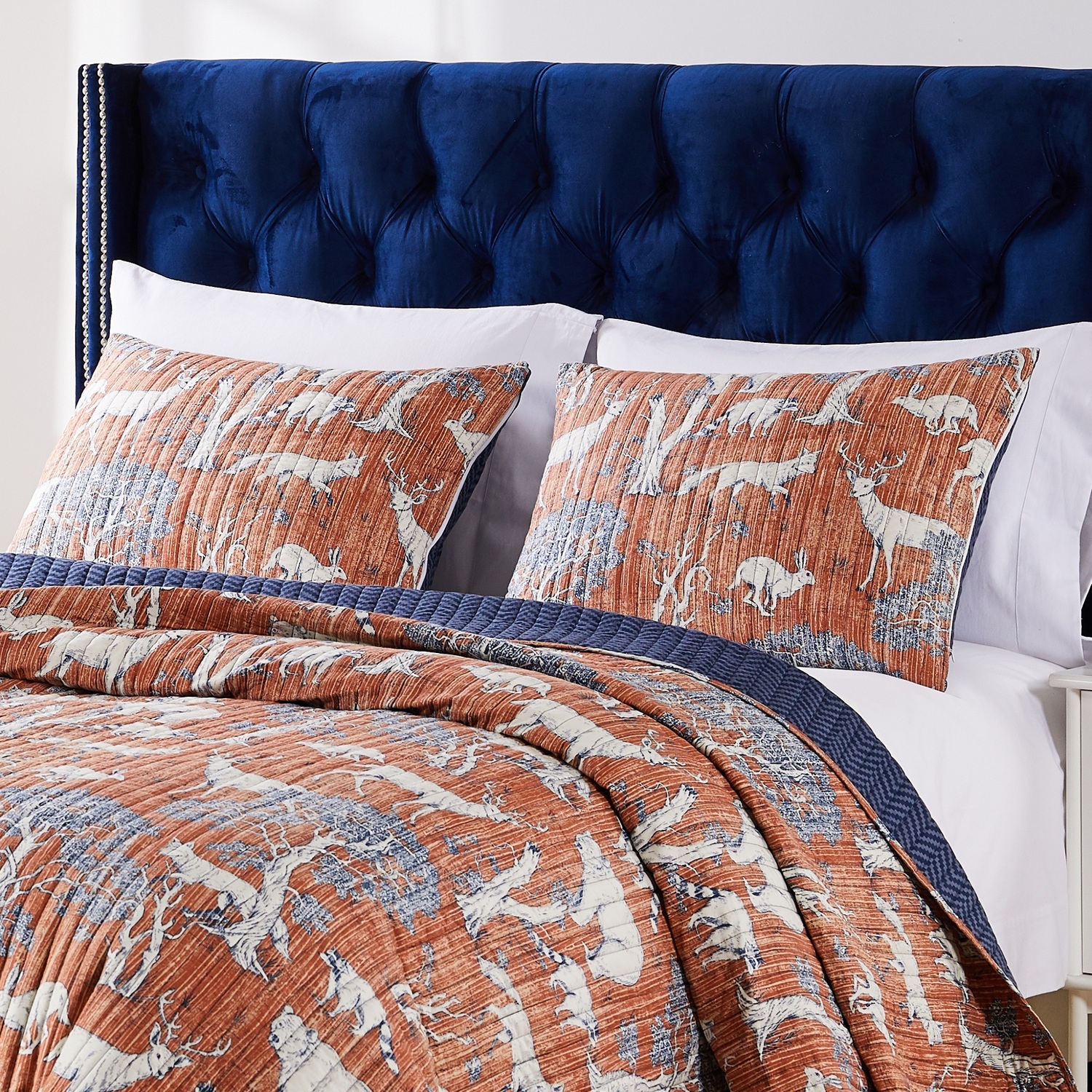 Rustic elegance with forest friends, the Menagerie pillow sham features gentle creatures keeping you company on a saffron ground with wood block print texture. Channel quilted for a refined look, Menagerie reverses to an all-over herringbone print in dark navy blue. Prewashed and preshrink. Machine quilted with fabric bound edges for durability. Dimensions: Standard Sham 20x26-inch, King Sham 20x36-inch, +/- 1". Reversible sham features zippered opening along the side to hold your pillow securely within. Machine quilted for durability and surface interest. 100% Microfiber polyester face and back; Cotton-rich fill, 60% cotton/40% polyester. Machine washable. ShamDimensions: Standard sham 20x26"es; King sham 20x36"es (+/- 2-inches). Reversible sham features zippered opening along the side to hold your pillow in placeChannel quilted for a refined lookMachine washable