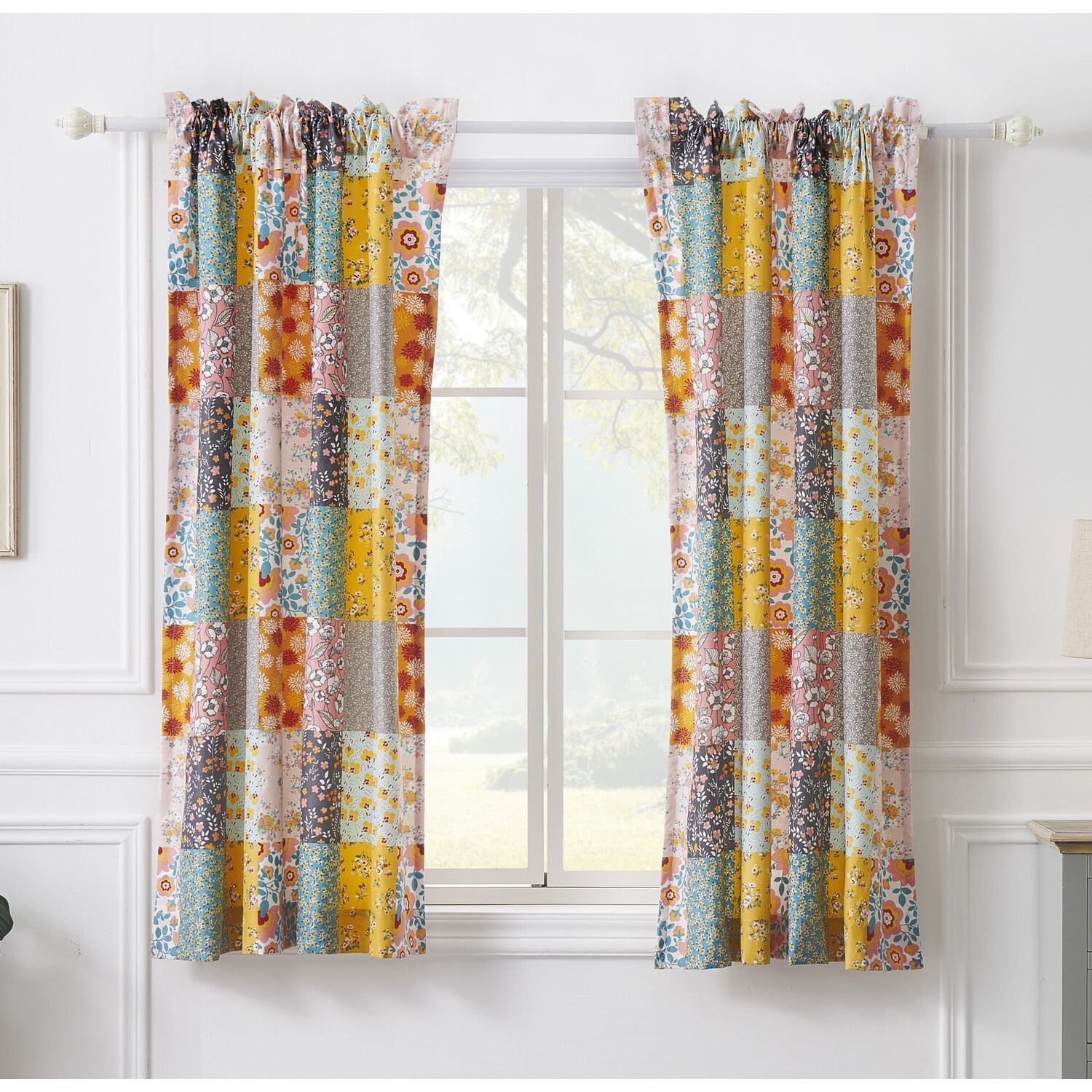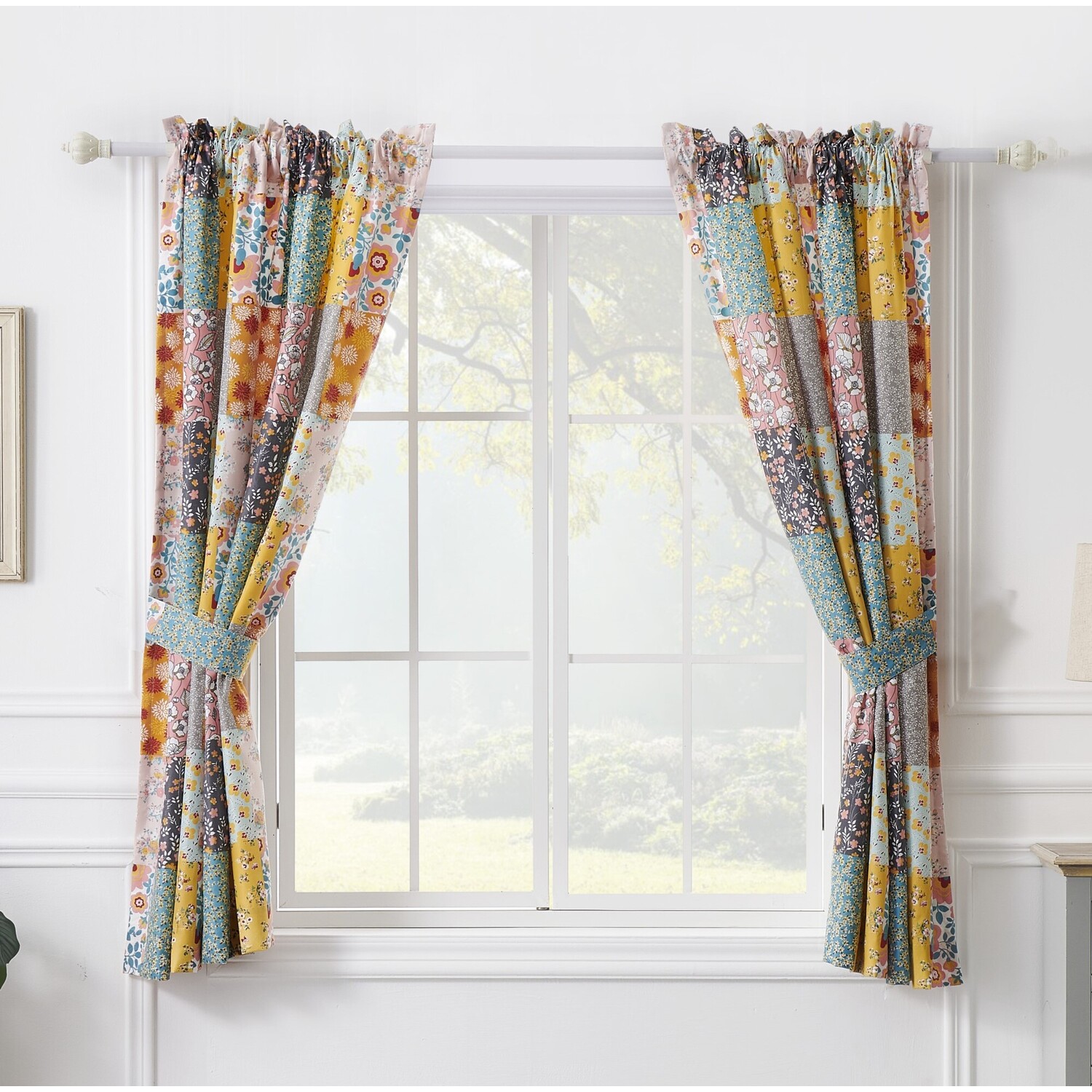 Brighten your space with the fresh, updated colors of the Carlie curtain panel set by Barefoot Bungalow. An eclectic blend of dreamy calico patterns in gold, pink, teal and turquoise creates a cheerful mood. This patchwork print features a two-inch header above the rod pocket for added character and dimension. Three-inch rod pocket along the top accommodates almost any curtain rod for hanging. Lined for increased privacy and sun protection. Dimensions: Each panel measures 50"es wide and 63"es long (x2), for a total window coverage area of 100"es x 63"es. Set includes two tie backs, each three"es wide and 24"es long each. Dimensions +/- 2”. Face fabric is 100% brushed microfiber. Liner is 100% brushed microfiber. Machine Wash.WindowLined for increased privacy and protection from the sunEach set features two panels and two tie backs.Three-inch rod pocket makes it easy to hang on almost any curtain rodMachine washable
