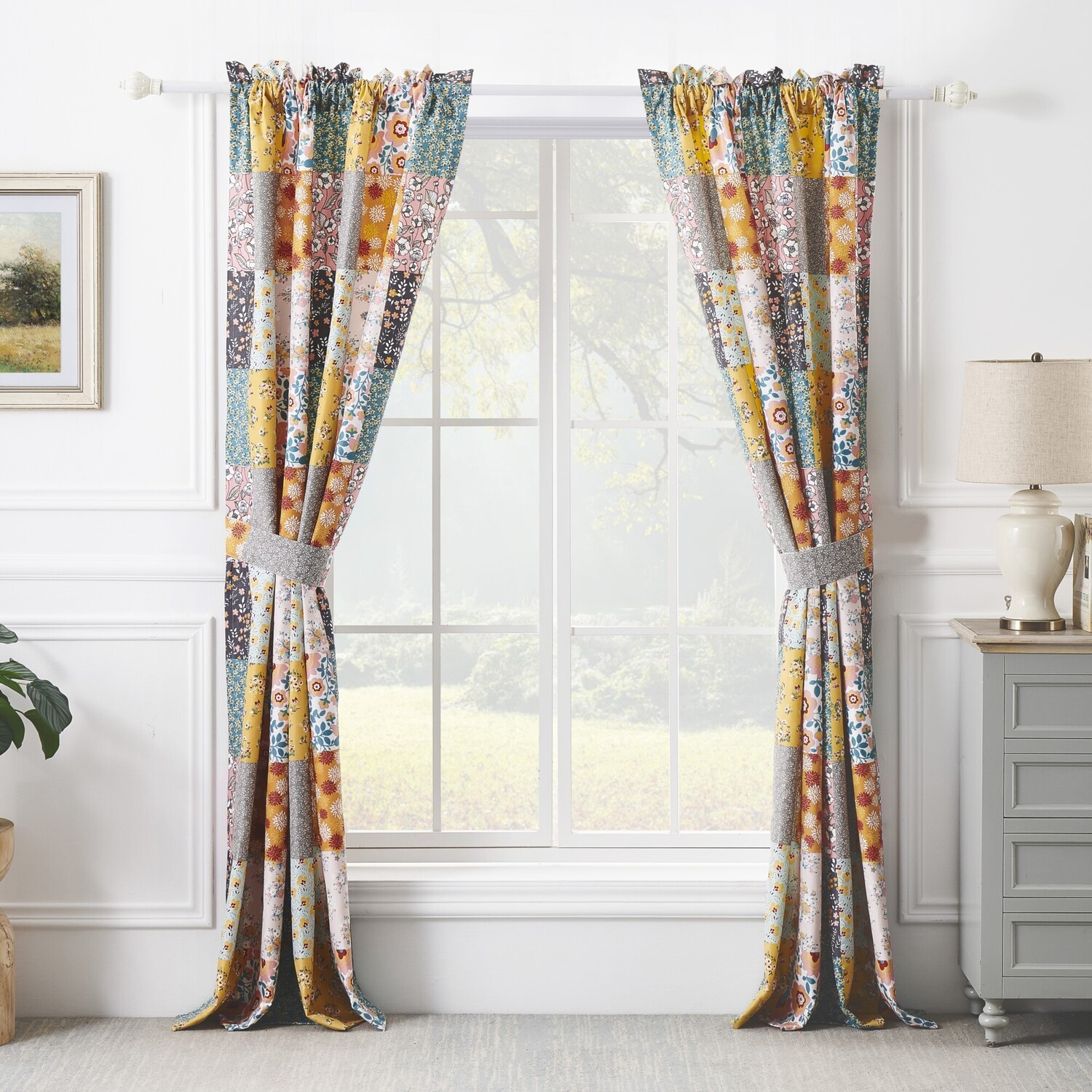 Brighten your space with the fresh, updated colors of the Carlie curtain panel set by Barefoot Bungalow. An eclectic blend of dreamy calico patterns in gold, pink, teal and turquoise creates a cheerful mood. This patchwork print features a two-inch header above the rod pocket for added character and dimension. Three-inch rod pocket along the top accommodates almost any curtain rod for hanging. Lined for increased privacy and sun protection. Dimensions: Each panel measures 50"es wide and 84"es long (x2), for a total window coverage area of 100"es x 84"es. Set includes two tie backs, each three"es wide and 24"es long each. Dimensions +/- 2”. Face fabric is 100% brushed microfiber. Liner is 100% brushed microfiber. Machine Wash.WindowLined for increased privacy and protection from the sunEach set features two panels and two tie backs.Three-inch rod pocket makes it easy to hang on almost any curtain rodMachine washable