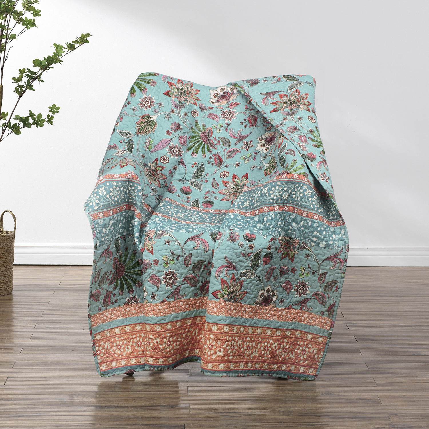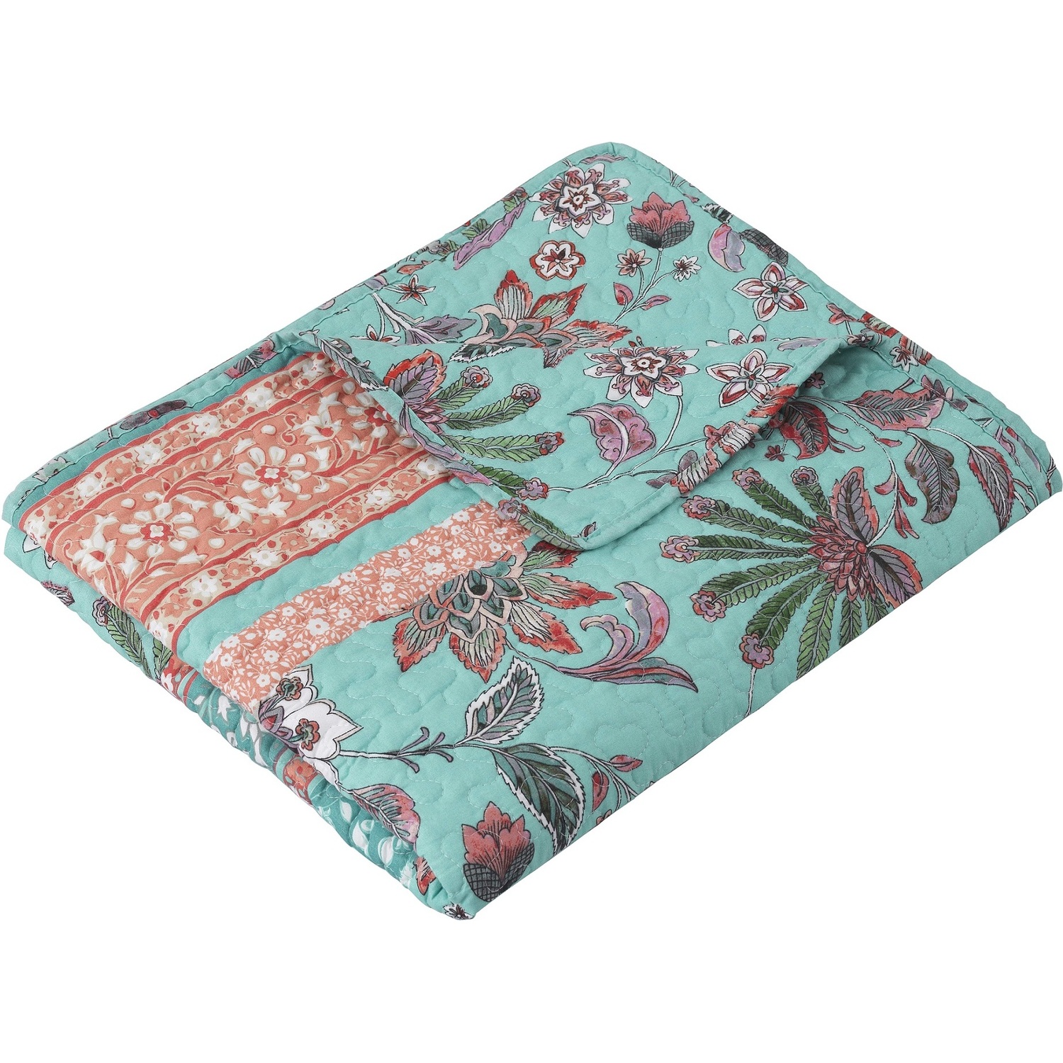 Add a chic boho vibe to your space with the Audrey quilted throw blanket. This pieced throw quilt features stylized jacobean fern and floral prints in turquoise and coral tones for an exotic, tropical look and feel. Reverses to an all-over jacobean print. Machine quilted with fabric bound edges for durability and surface interest. Throw dimensions: 50x60"es, +/- 2-inches. Machine Wash. 100% microfiber polyester face and back with cotton rich fill (60% cotton, 40% polyester), prewashed with extra softener for extra softness and comfort. AccessoryThrow measures 50 x 60"es (+/- 2"es)The perfect quilt for your favorite chair or sofa.Features stylized jacobean fern and floral prints in turquoise and coral tones for an exotic, tropical look and feel.PREWASHED and pre-shrunk for a soft, comfortable feel and a perfect fit right out of the packageMachine washable.