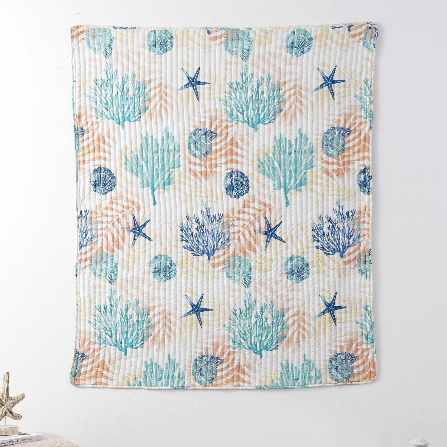 Slip into something more coastal with the Montego quilted throw blanket. Relax in the shade of palm fronds beside a sea of tranquility bathed in teal blue, sunset orange and gold. Fresh sea breeze motifs create a calming mood. Throw reverses to an all-over solid aquamarine. Machine quilted with fabric bound edges for durability and surface interest. Dimensions: 50x60"es (+/- 2”). 100% Microfiber polyester face and back; 100% Polyester fill. Machine Wash. Imported.AccessoryThrow measures 50 x 60"es (+/- 2"es)The perfect quilt for your casual spaceReverses to a coordinate solid color aqua for two looks in one!Machine washable