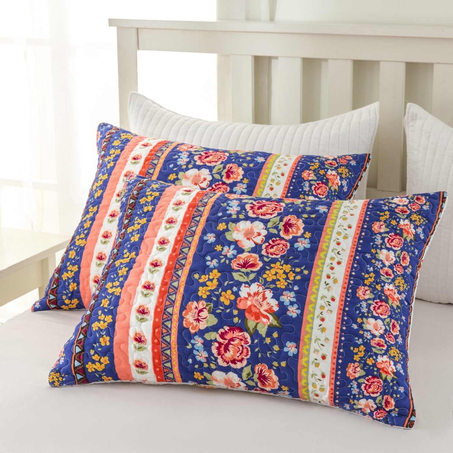 Capture the essence of a festive garden with the Marsha quilted pillow sham. Each versatile sham features a unique floral stripe on one side and an all-over polka dot print the other. Reversible shams allow you to mix and match them to change the look of your bed. Bold, vibrant colors include grenadine, honey-gold, sage, aquamarine, rosewood and camellia on a deep blue ground. Machine quilted with fabric bound edges for durability and surface interest. Dimensions: Standard sham 20x26"es; King sham 20x36"es (+/- 2-inches). Machine Wash. 100% microfiber polyester face and back with cotton rich fill (60% cotton, 40% polyester), prewashed for extra softness and comfort. ShamDimensions: Standard sham 20x26"es; King sham 20x36"es (+/- 2-inches)Double down on the look with extra pillow shams! Each sham reverses to an all-over [polka dot print for two looks in oneZipper along the side to hold your pillow in place makes these shams truly reversible so you easily change up the look of your bedMachine washable.