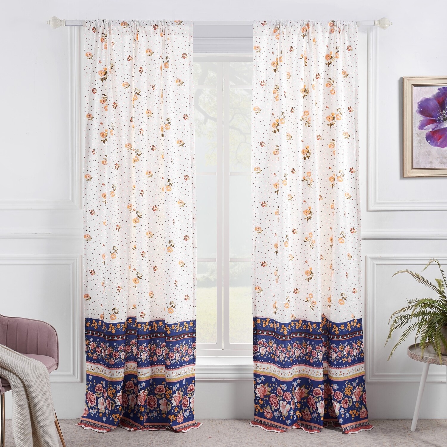 Capture the essence of a festive garden with the Marsha curtain panel set. Each panel set features a polka dot and flower print on the top and richly decorated borders on the bottom. The panel tops are white with natural colors. The contrasting border features bold, vibrant colors including grenadine, honey-gold, sage, aquamarine, rosewood and camellia on a deep blue ground. Lined with solid color fabric for increased privacy and sun protection, each 4-Piece curtain panel set includes two panels and two tie backs. Dimensions: Each panel measures 84"es long x 42"es wide (x2) for total coverage area of 84 x 84"es. 100% polyester face, back (2 ply). Three-inch rod pocket along the top fits most curtain rods for hanging. Machine wash. Imported.WindowEach 4-piece set features two panels and two tie backsDimensions: Each panel measures 84"es long x 42"es wide (x2). Overall dimensions of set, 84"es x 84"es.Lined for increased privacy and sun protectionMachine washable