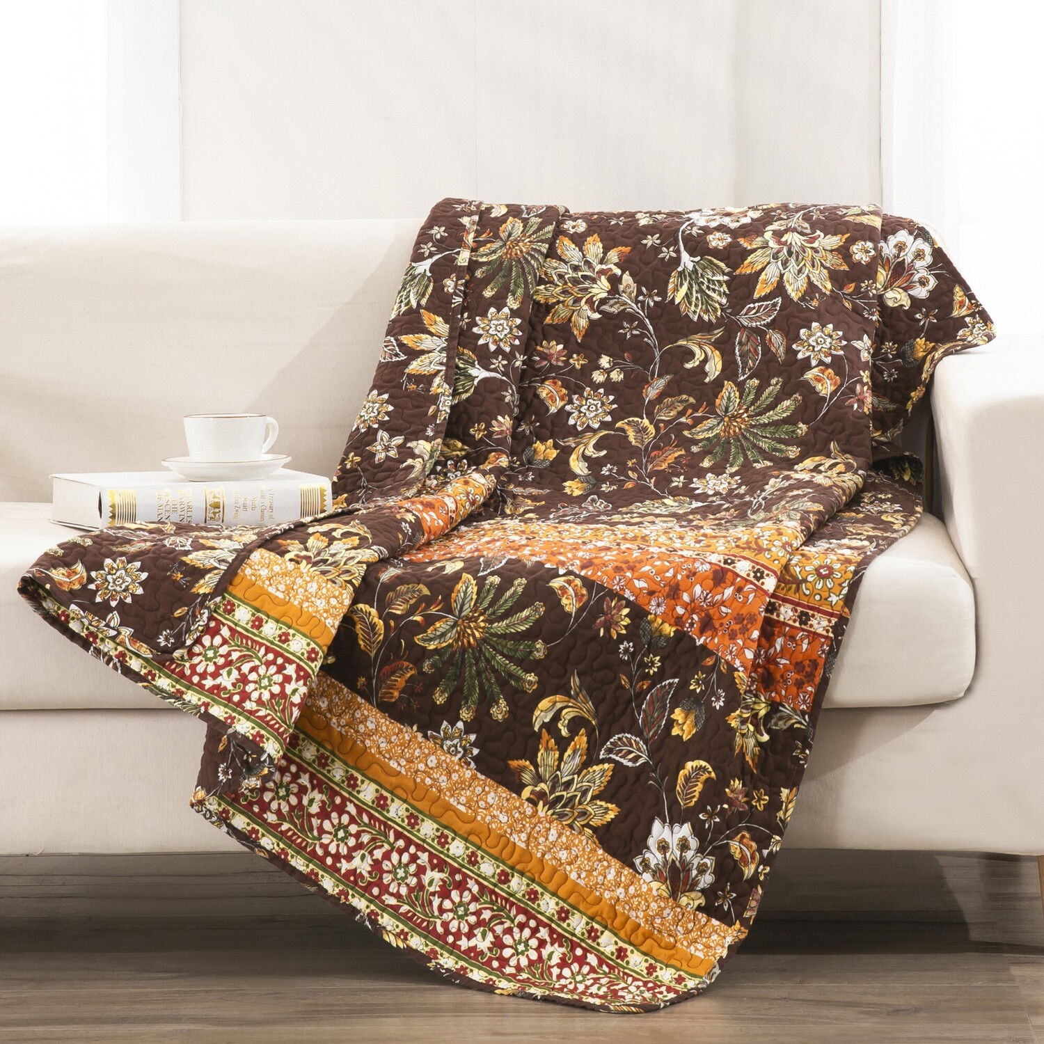 Add a chic boho vibe to your space with the Audrey quilted throw blanket. This pieced throw quilt features stylized jacobean fern and floral prints in chocolate and gold tones for an exotic look and feel. Reverses to an all-over jacobean print. Machine quilted with fabric bound edges for durability and surface interest. Throw dimensions: 50x60"es, +/- 2-inches. Machine Wash. 100% microfiber polyester face and back with cotton rich fill (60% cotton, 40% polyester), prewashed with extra softener for extra softness and comfort. AccessoryThrow measures 50 x 60"es (+/- 2"es)The perfect quilt for your favorite chair or sofa, also makes a decorative wall hangingFeatures stylized jacobean fern and floral prints in chocolate and gold tones for an exotic look and feel.PREWASHED and pre-shrunk for a soft, comfortable feel and a perfect fit right out of the packageMachine washable.