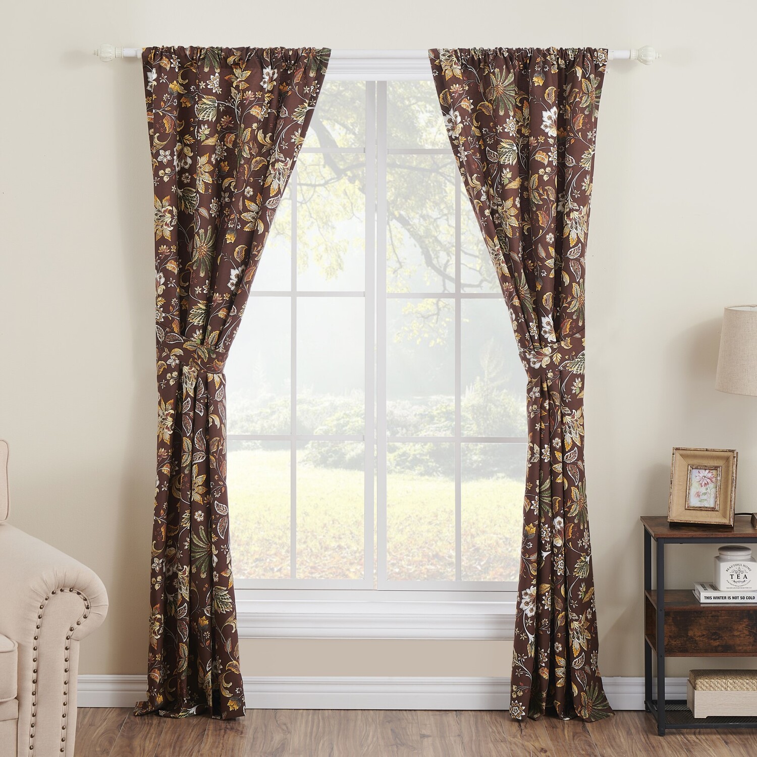 Add a chic boho vibe to your space with the Audrey 4-piece curtain panel set. Stylized jacobean fern and floral prints in chocolate and gold tones create an exotic look and feel. Each set features two panels and two tie backs. Dimensions: Each panel measures 42"es wide x 84"es long. Total window coverage, 84"es x 84"es. Lined for increased privacy and protection from the sun. Three-inch rod pocket along the top fit most curtain rods for hanging. 100% polyester microfiber. Machine washable.WindowEach 4-piece set features two panels and two tie backsDimensions: Each panel measures 84"es long x 42"es wide (x2). Overall dimensions of set, 84"es x 84"es.Lined for increased privacy and sun protectionMachine washable