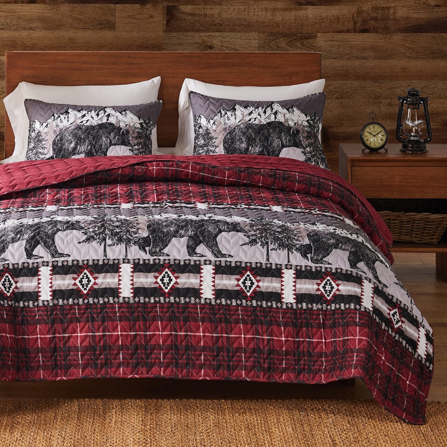 The lodge look feels right at home with the Timberline quilt set. This versatile bedding creates a cozy, backwoods mood with black and red plaid, native Southwest motifs, snowcapped mountains and lumbering bear. Center envelope closure on plaid reverse of each pillow sham features cloth ties to hold your pillow in place. Chevron quilting enhances the durability of each piece. Oversized for better coverage on today’s deeper mattresses. Machine quilted with fabric bound edges for durability and surface interest. Quilt set comes with quilt and two pillow shams (one sham per Twin set). Dimensions: Twin/XL set includes one 68x88-inch quilt plus one 20x26-inch pillow sham, Full/Queen set includes one 90x90-inch quilt plus two 20x26-inch pillow shams, King/Cal King set includes one 105x95-inch quilt plus two 20x36-inch pillow shams. (All dimensions +/- 2”). 100% Microfiber polyester face and back; 100% Polyester fill. Machine Wash. Imported.Quilt SetWHAT'S INCLUDED: Each set comes with quilt plus two pillow shams (one sham with twin set)DIMENSIONS: Twin/XL set includes one 68x88-inch quilt plus one 20x26-inch pillow sham, Full/Queen set includes one 90x90-inch quilt plus two 20x26-inch pillow shams, King/Cal King set includes one 105x95-inch quilt plus two 20x36-inch pillow shams (all diOVERSIZED for better coverage on today's deeper mattressesMachine washable.