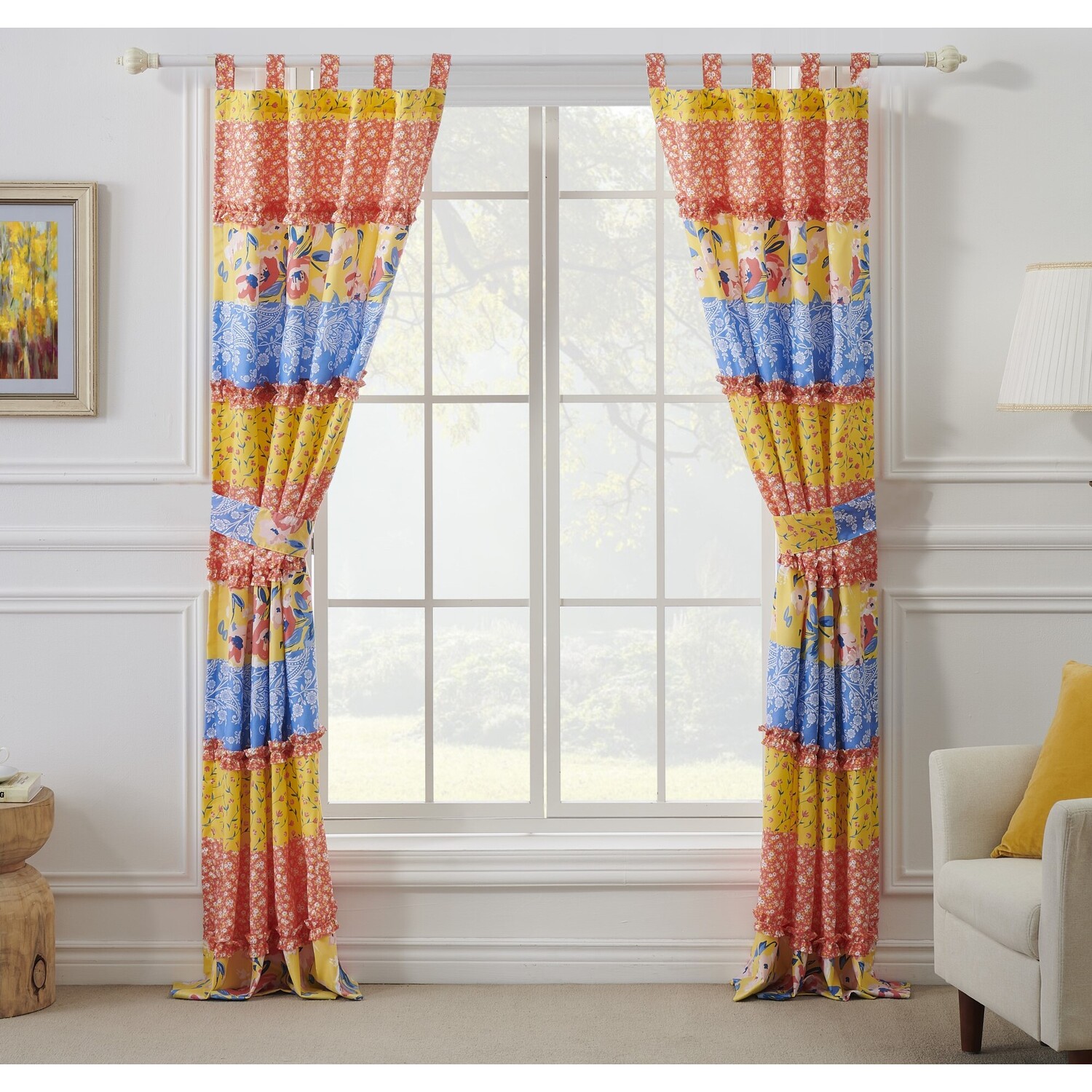 The Skylar ruffle-embellished tab-top panel pair adds vintage bohemian styling with warm, bright colors. Each panel features rows of ruffles, adding unique character to this curtain panel set. Set includes two panels and two tiebacks. Three-inch tabs along the top accommodate almost any curtain rod for hanging. Lined for increased privacy and sun protection. Dimensions: Each panel measures 42"es wide and 84"es long (x2), for a total window coverage area of 84"es x 84"es. Set includes two tie backs, each three"es wide and 24"es long each. Dimensions +/- 2”. Face fabric is 100% brushed microfiber. Liner is 100% brushed microfiber. Machine Wash.WindowEach 4-piece set features two panels and two tie backsDimensions: Each panel measures 84"es long x 42"es wide (x2). Overall dimensions of set, 84"es x 84"es.Lined for increased privacy and sun protectionMachine washable
