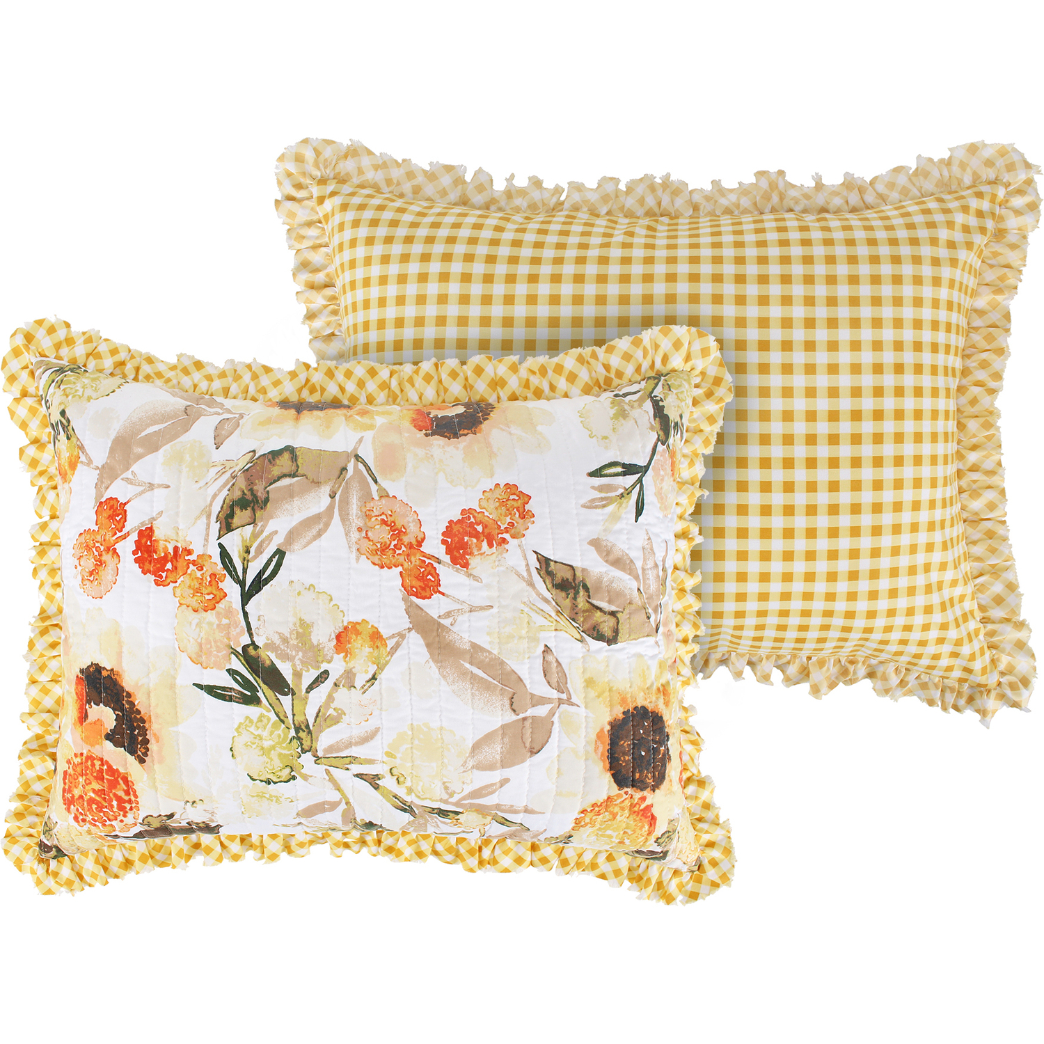 Wrap yourself in sunshine. With watercolor sunflowers on the face, and golden gingham ruffles around the border, Somerset transforms your space with country farmhouse style. Light weight for year-round comfort and channel quilted in rows that bring to mind furrowed fields of America's heartland, Somerset adds a subtle seasonal accent to your room with pops of color. Reverses to an all-over gingham print in gold and white. Includes one pillow sham. Dimensions: Standard sham measures 20x26"es; King sham measures 20x36"es (all dimensions +/- 1"). Machine Wash. Machine washable. 100% brushed microfiber face and back; cotton rich 60% cotton, 40% polyester fill. Double down on the look and buy two.ShamDimensions: Standard sham 20x26"es; King sham 20x36"es (+/- 2-inches)Double down on the look with extra pillow shams!Zipper along the side to hold your pillow in place makes these shams truly reversible so you easily change up the look of your bedPREWASHED and pre-shrunk for a soft, comfortable feel and a perfect fit right out of the packageMachine washable.